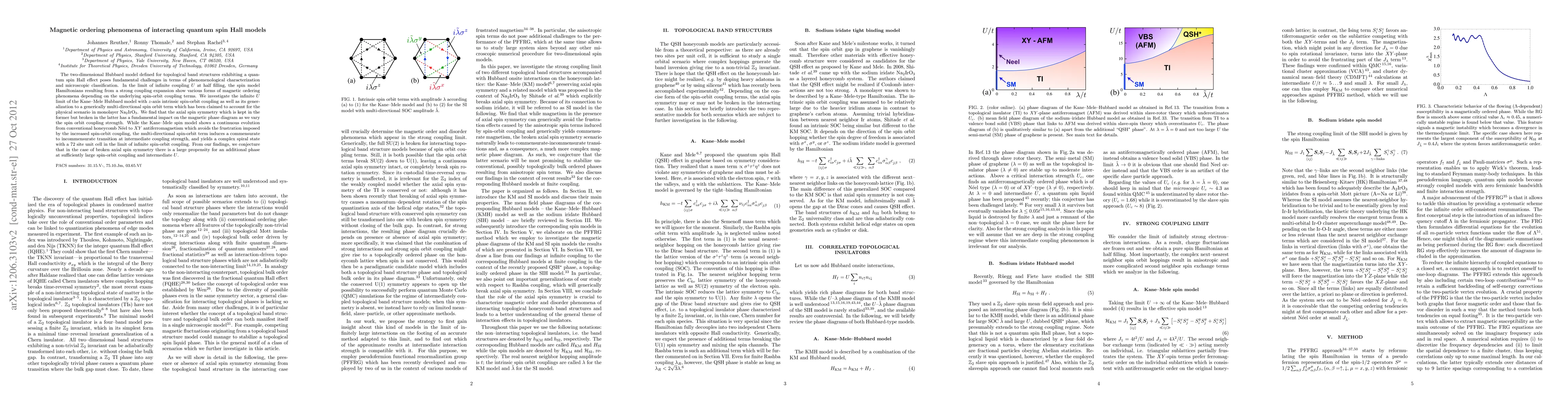 The two-dimensional Hubbard model defined for topological band structures exhibiting a quantum spin Hall effect poses fundamental challenges in terms of phenomenological characterization and microscopic classification. In the limit of infinite coupling U at half filling, the spin model Hamiltonians resulting from a strong coupling expansion show various forms of magnetic ordering phenomena depending on the underlying spin-orbit coupling terms. We investigate the infinite U limit of the Kane-Mele Hubbard model with z-axis intrinsic spin-orbit coupling as well as its generalization to a generically multi-directional spin orbit term which has been claimed to account for the physical scenario in monolayer Na2IrO3. We find that the axial spin symmetry which is kept in the former but broken in the latter has a fundamental impact on the magnetic phase diagram as we vary the spin orbit coupling strength. While the Kane-Mele spin model shows a continuous evolution from conventional honeycomb Neel to XY antiferromagnetism which avoids the frustration imposed by the increased spin-orbit coupling, the multi-directional spin-orbit term induces a commensurate to incommensurate transition at intermediate coupling strength, and yields a complex spiral state with a 72 site unit cell in the limit of infinite spin-orbit coupling. From our findings, we conjecture that in the case of broken axial spin symmetry there is a large propensity for an additional phase at sufficiently large spin-orbit coupling and intermediate U.