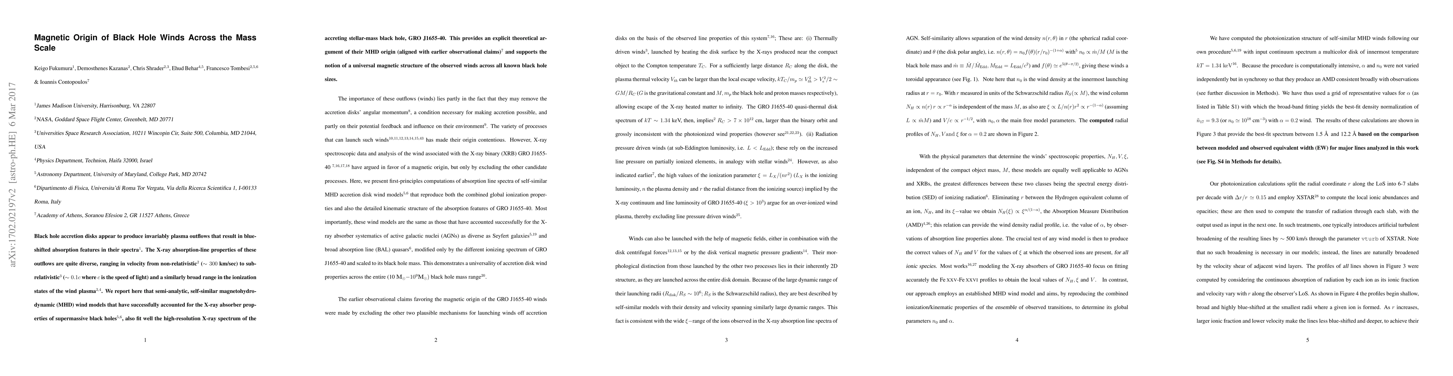 Black hole accretion disks appear to produce invariably plasma outflows that result in blue-shifted absorption features in their spectra. The X-ray absorption-line properties of these outflows are quite diverse, ranging in velocity from non-relativistic ($\sim 300$ km/sec) to sub-relativistic ($\sim 0.1c$ where $c$ is the speed of light) and a similarly broad range in the ionization states of the wind plasma. We report here that semi-analytic, self-similar magnetohydrodynamic (MHD) wind models that have successfully accounted for the X-ray absorber properties of supermassive black holes, also fit well the high-resolution X-ray spectrum of the accreting stellar-mass black hole, GRO J1655-40. This provides an explicit theoretical argument of their MHD origin (aligned with earlier observational claims) and supports the notion of a universal magnetic structure of the observed winds across all known black hole sizes.