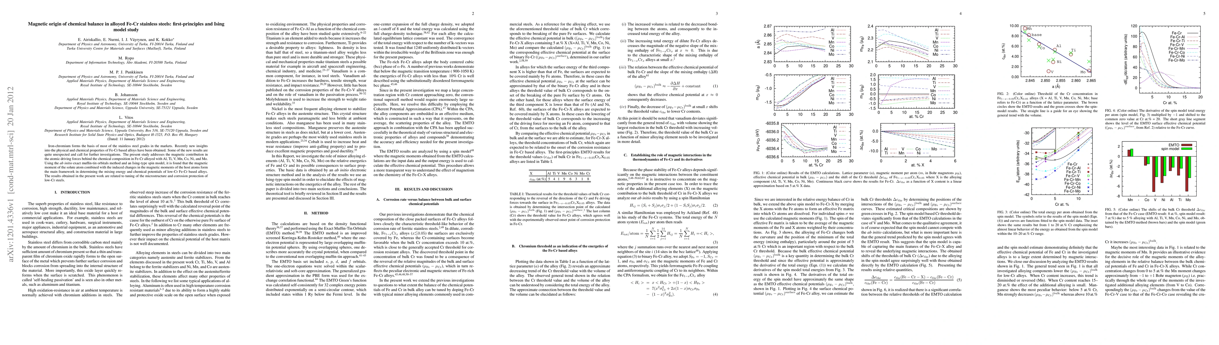 This study investigates the magnetic contributions influencing the chemical balance in Fe-Cr stainless steels alloyed with various elements using first-principles calculations and an Ising model. It finds that the magnetic moments of solute atoms and induced changes in host atoms' magnetic moments primarily determine the mixing energy and chemical potentials, impacting microstructure tuning and corrosion protection.