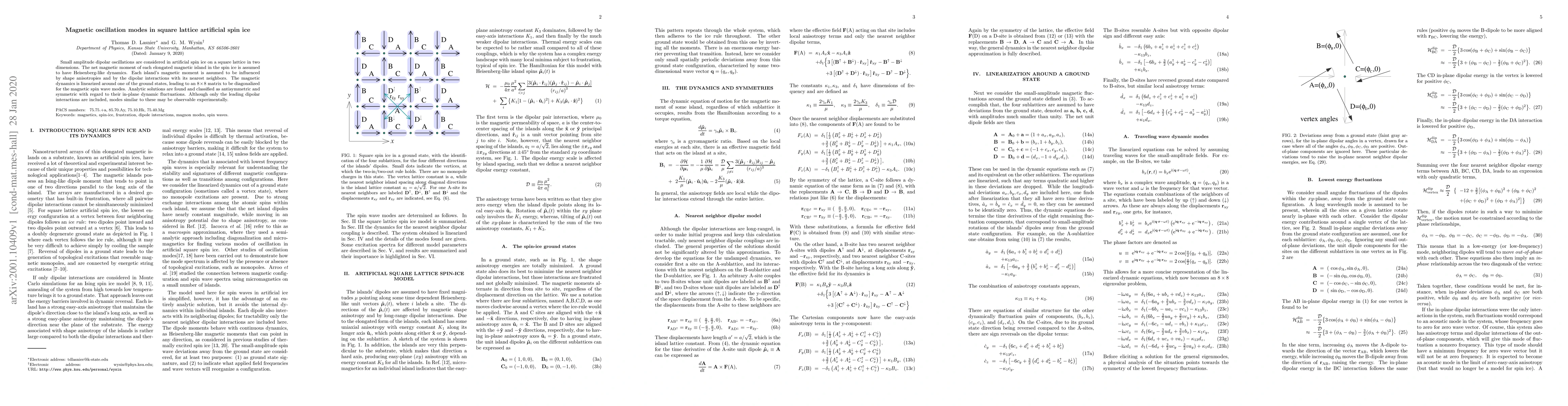 Small amplitude dipolar oscillations are considered in artificial spin ice on a square lattice in two dimensions. The net magnetic moment of each elongated magnetic island in the spin ice is assumed to have Heisenberg-like dynamics. Each island's magnetic moment is assumed to be influenced by shape anisotropies and by the dipolar interactions with its nearest neighbors. The magnetic dynamics is linearized around one of the ground states, leading to an $8\times 8$ matrix to be diagonalized for the magnetic spin wave modes. Analytic solutions are found and classified as antisymmetric and symmetric with regard to their in-plane dynamic fluctuations. Although only the leading dipolar interactions are included, modes similar to these may be observable experimentally.