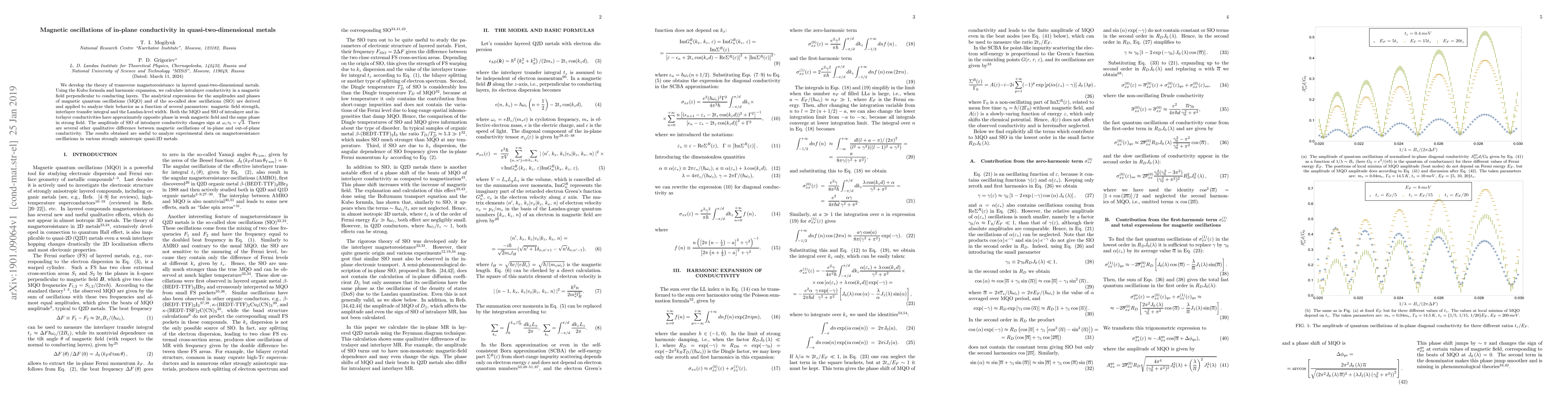 We develop the theory of transverse magnetoresistance in layered quasi-two-dimensional metals. Using the Kubo formula and harmonic expansion, we calculate intralayer conductivity in a magnetic field perpendicular to conducting layers. The analytical expressions for the amplitudes and phases of magnetic quantum oscillations (MQO) and of the so-called slow oscillations (SlO) are derived and applied to analyze their behavior as a function of several parameters: magnetic field strength, interlayer transfer integral and the Landau-level width. Both the MQO and SlO of intralayer and interlayer conductivities have approximately opposite phase in weak magnetic field and the same phase in strong field. The amplitude of SlO of intralayer conductivity changes sign at $\omega_c\tau_0=\sqrt{3}$. There are several other qualitative difference between magnetic oscillations of in-plane and out-of-plane conductivity. The results obtained are useful to analyze experimental data on magnetoresistance oscillations in various strongly anisotropic quasi-2D metals.