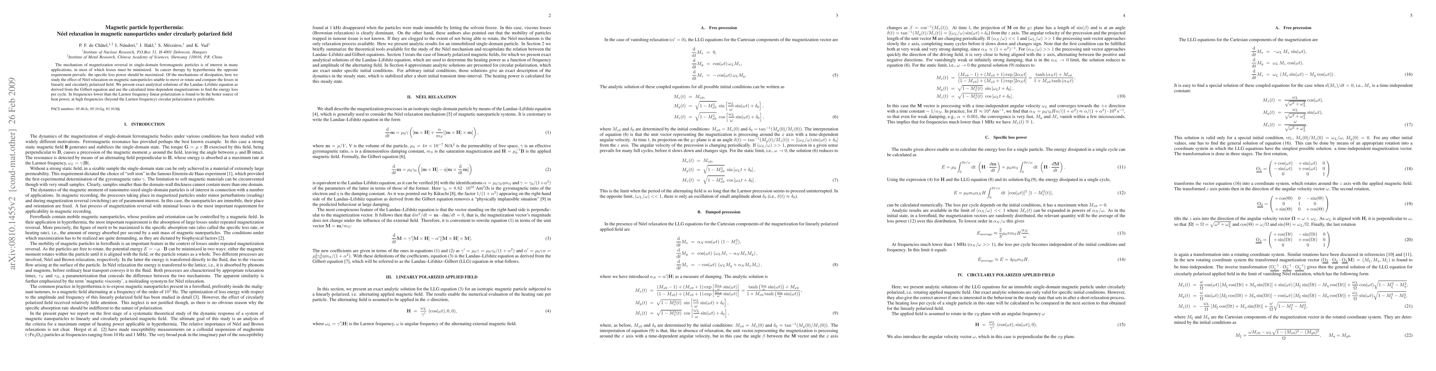 This paper investigates Neel relaxation in magnetic nanoparticles for hyperthermia applications, comparing energy loss from linear vs. circularly polarized magnetic fields. It finds that linear polarization is more effective at lower frequencies, while circular polarization is preferable at higher frequencies.