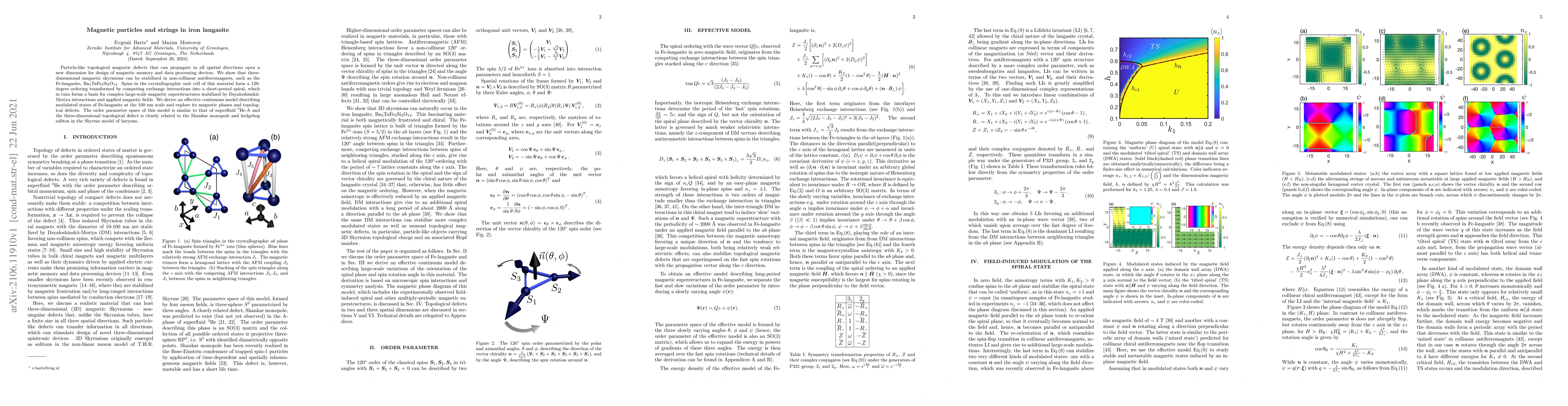 Particle-like topological magnetic defects that can propagate in all spatial directions open a new dimension for design of magnetic memory and data processing devices. We show that three-dimensional magnetic skyrmions can be stabilized in non-collinear antiferromagnets, such as the Fe-langasite, Ba$_3$TaFe$_3$Si$_2$O$_{14}$. Spins in the crystallographic unit cell of this material form a 120-degree ordering transformed by competing exchange interactions into a short-period spiral, which in turn forms a basis for complex large-scale magnetic superstructures stabilized by Dzyaloshinskii-Moriya interactions and applied magnetic fields. We derive an effective continuum model describing modulated states of Fe-langasite at the 100 nm scale and explore its magnetic phases and topological defects. The order parameter space of this model is similar to that of superfluid $^{3}$He-A and the three-dimensional topological defect is closely related to the Shankar monopole and hedgehog soliton in the Skyrme model of baryons.