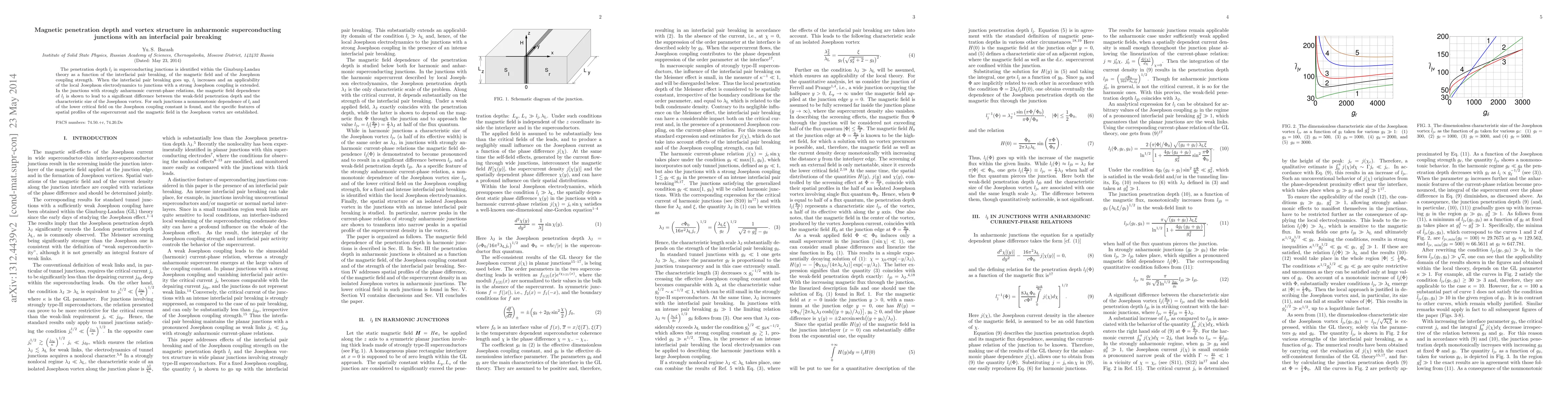 This paper investigates the magnetic penetration depth and vortex structure in superconducting junctions under the influence of interfacial pair breaking and magnetic field, revealing a nonmonotonic dependence on the Josephson coupling constant and establishing specific spatial profiles for supercurrent and magnetic field in strongly anharmonic junctions.