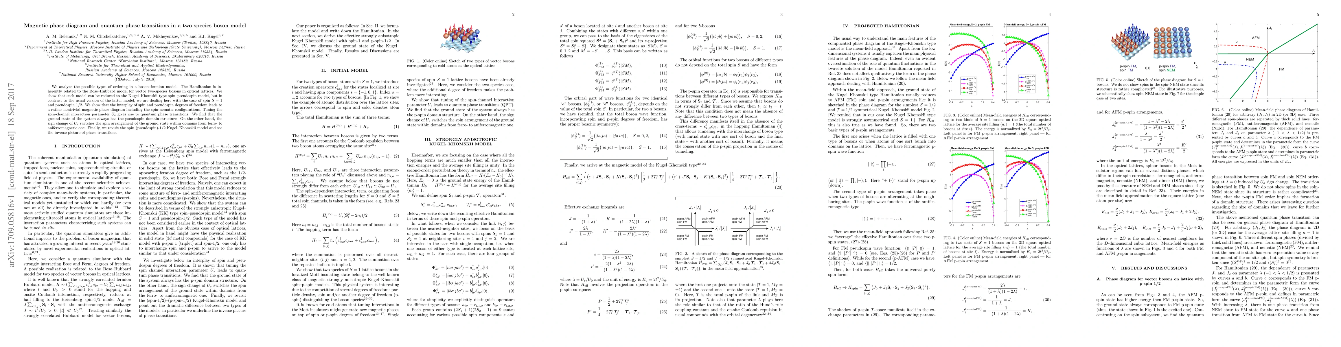 We analyze the possible types of ordering in a boson--fermion model. The Hamiltonian is inherently related to the Bose--Hubbard model for vector two-species bosons in optical lattices. We show that such model can be reduced to the Kugel--Khomskii type spin--pseudospin model, but in contrast to the usual version of the latter model, we are dealing here with the case of spin $S=1$ and pseudospin $1/2$. We show that the interplay of spin and pseudospin degrees of freedom leads to a rather nontrivial magnetic phase diagram including the spin-nematic configurations. Tuning the spin-channel interaction parameter $U_s$ gives rise to quantum phase transitions. We find that the ground state of the system always has the pseudospin domain structure. On the other hand, the sign change of $U_s$ switches the spin arrangement of the ground state within domains from ferro- to aniferromagnetic one. Finally, we revisit the spin (pseudospin)-1/2 Kugel--Khomskii model and see the inverse picture of phase transitions.