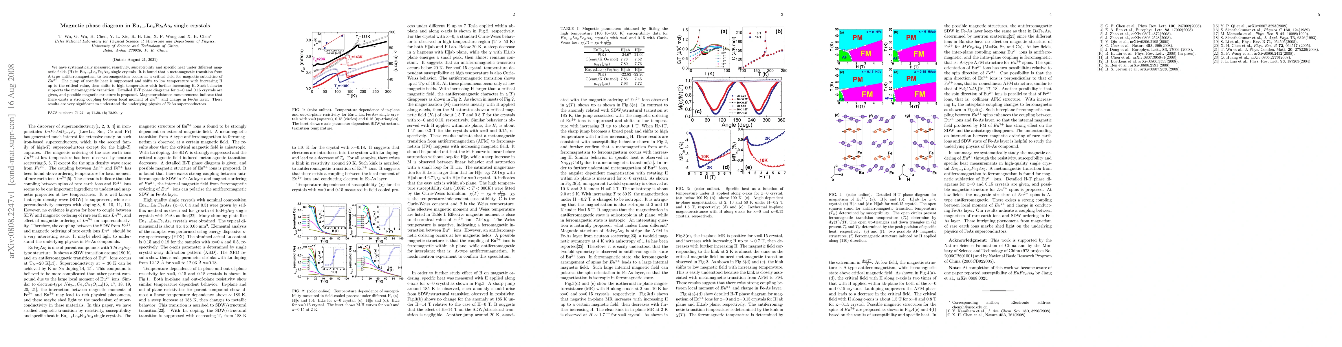 This study investigates the magnetic phase diagram of Eu$_{1-x}$La$_x$Fe$_2$As$_2$ single crystals, revealing a metamagnetic transition from A-type antiferromagnetism to ferromagnetism driven by the $Eu^{2+}$ sublattice. The specific heat behavior supports this transition, and magnetoresistance shows strong coupling between $Eu^{2+}$ and Fe-As layers.