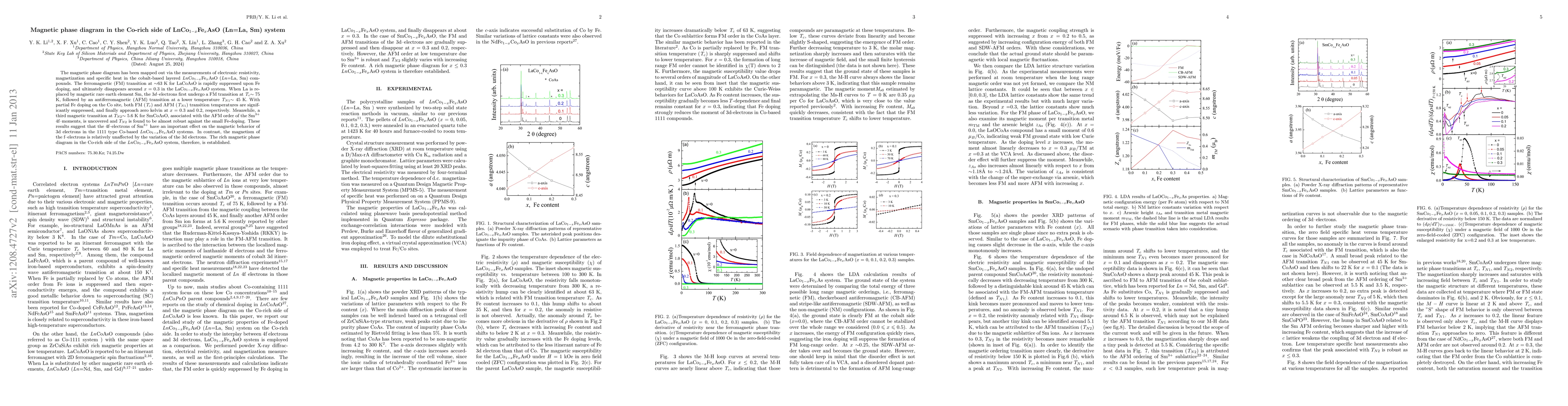 The magnetic phase diagram has been mapped out via the measurements of electronic resistivity, magnetization and specific heat in the cobalt-based layered LnCo1-xFexAsO (Ln=La, Sm) compounds. The ferromagnetic (FM) transition at 63 K for LaCoAsO is rapidly suppressed upon Fe doping, and ultimately disappears around x=0.3 in the LaCo1-xFexAsO system. When La is replaced by magnetic rare earth element Sm, the 3d electrons first undergo a FM transition at Tc = 75 K, followed by an antiferromagnetic (AFM) transition at a lower temperature TN1 = 45 K. With partial Fe doping on the Co site, both FM (Tc) and AFM (TN1) transition temperatures are significantly suppressed, and finally approach zero kelvin at x = 0.3 and 0.2, respectively. Meanwhile, a third magnetic transition at TN2 = 5.6 K for SmCoAsO, associated with the AFM order of the Sm3+ 4f-oments, is uncovered and TN2 is found to be almost robust against the small Fe-doping. These results suggest that the 4f electrons of Sm3+ have an important effect on the magnetic behavior of 3d electrons in the 1111 type Co-based LnCo1-xFexAsO systems. In contrast, the magnetism of the f-electrons is relatively unaffected by the variation of the 3d electrons. The rich magnetic phase diagram in the Co-rich side of the LnCo1-xFexAsO system, therefore, is established.