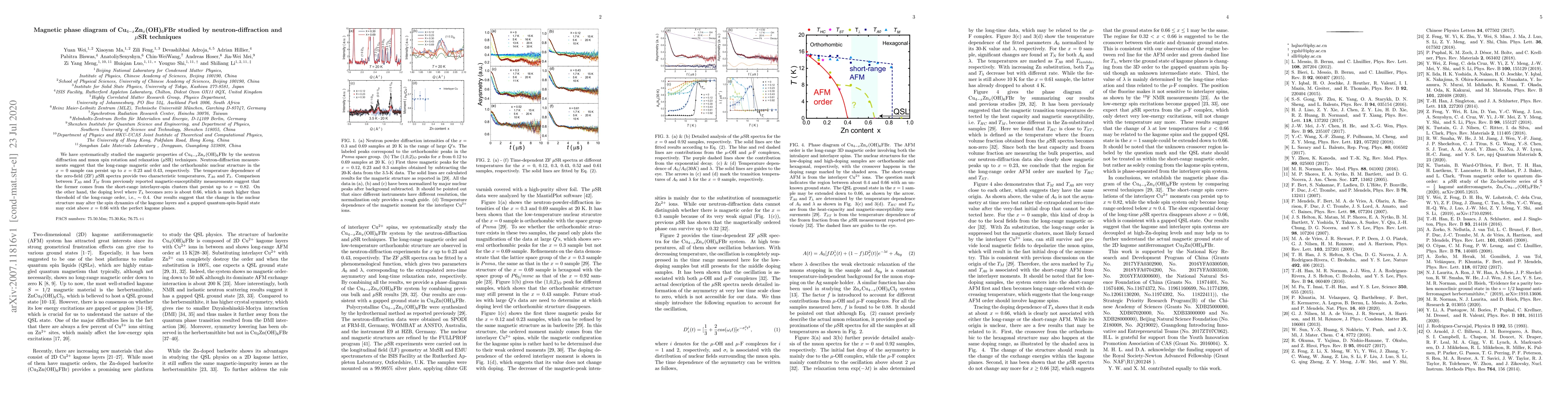 We have systematically studied the magnetic properties of Cu$_{4-x}$Zn$_x$(OH)$_6$FBr by the neutron diffraction and muon spin rotation and relaxation ($\mu$SR) techniques. Neutron-diffraction measurements suggest that the long-range magnetic order and the orthorhombic nuclear structure in the $x$ = 0 sample can persist up to $x$ = 0.23 and 0.43, respectively. The temperature dependence of the zero-field (ZF) $\mu$SR spectra provide two characteristic temperatures, $T_{A0}$ and $T_{\lambda}$. Comparison between $T_{A0}$ and $T_M$ from previously reported magnetic-susceptibility measurements suggest that the former comes from the short-range interlayer-spin clusters that persist up to $x$ = 0.82. On the other hand, the doping level where $T_{\lambda}$ becomes zero is about 0.66, which is much higher than threshold of the long-range order, i.e., $\sim$ 0.4. Our results suggest that the change in the nuclear structure may alter the spin dynamics of the kagome layers and a gapped quantum-spin-liquid state may exist above $x$ = 0.66 with the perfect kagome planes.