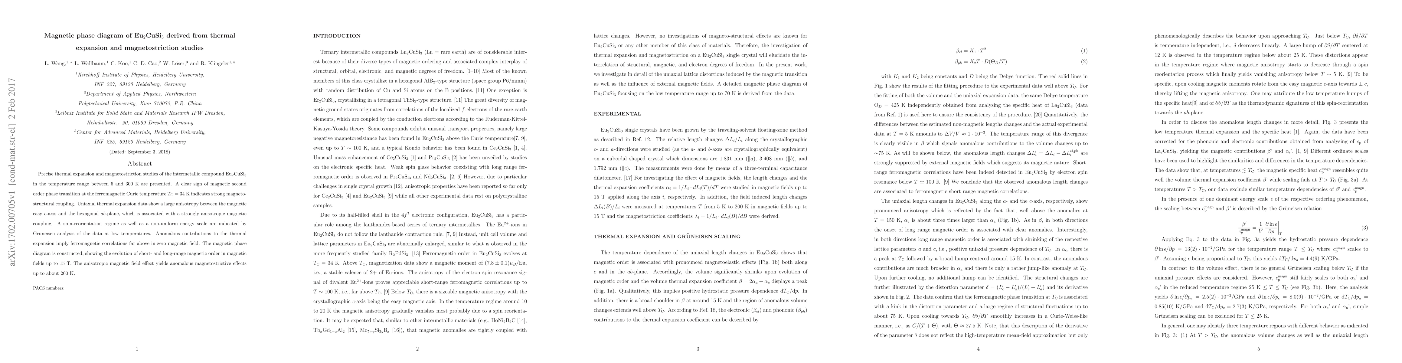This study presents detailed thermal expansion and magnetostriction analyses of Eu$_2$CuSi$_3$, revealing a ferromagnetic Curie temperature of 34 K and strong magneto-structural coupling. The magnetic phase diagram illustrates the evolution of magnetic order under various magnetic fields, highlighting anisotropic effects and a spin-reorientation regime.