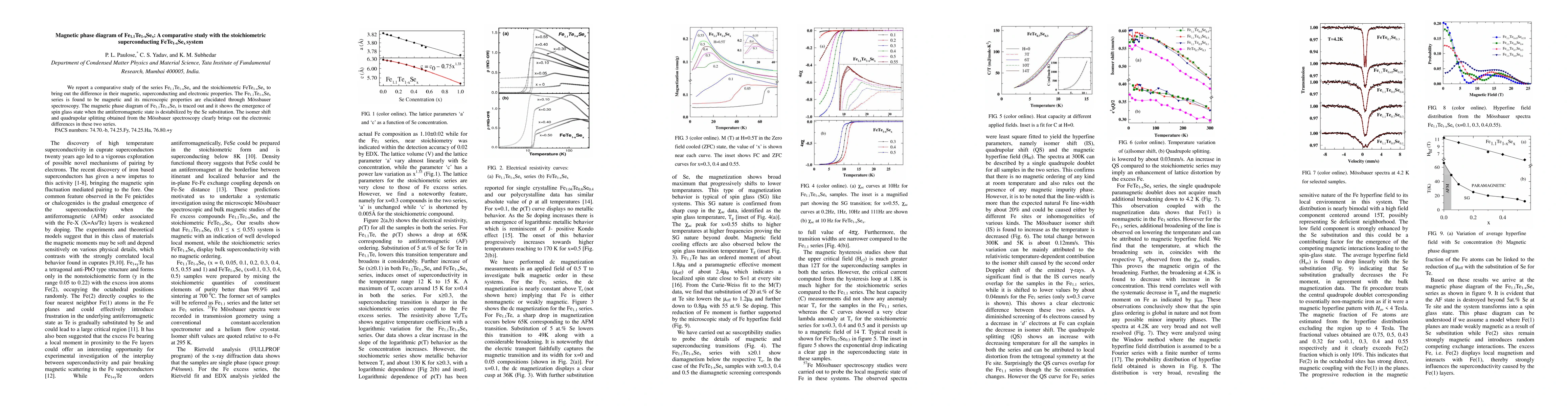 We report a comparative study of the series Fe1.1Te1-xSex and the stoichiometric FeTe1-xSex to bring out the difference in their magnetic, superconducting and electronic properties. The Fe1.1Te1-xSex series is found to be magnetic and its microscopic properties are elucidated through Moessbauer spectroscopy. The magnetic phase diagram of Fe1.1Te1-xSex is traced out and it shows the emergence of spin-glass state when the antiferromagnetic state is destabilized by the Se substitution. The isomer shift and quadrupolar splitting obtained from the Moessbauer spectroscopy clearly brings out the electronic differences in these two series.