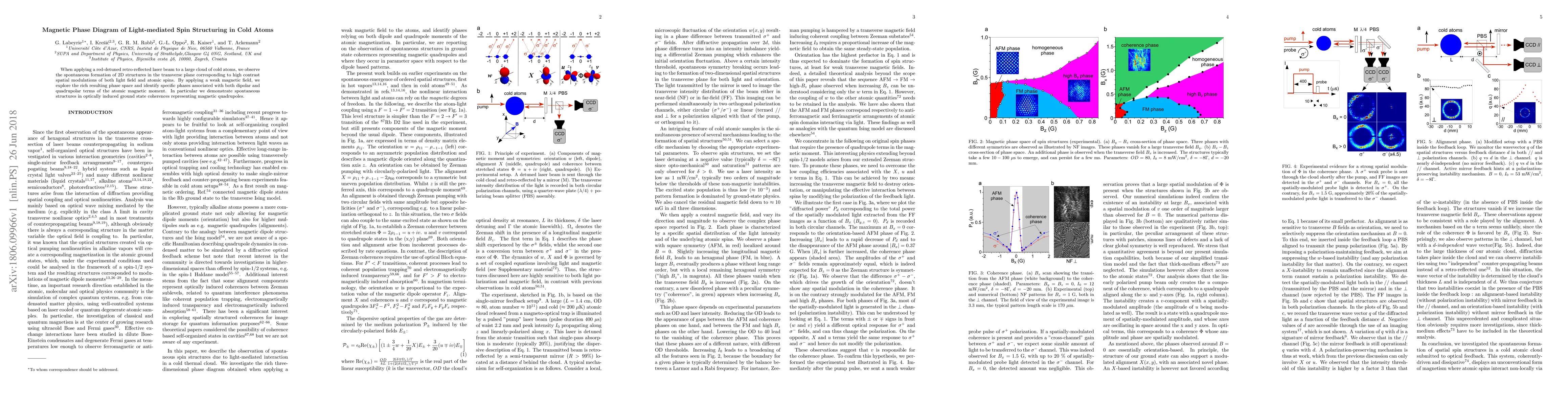 This study investigates the magnetic phase diagram of spin structures formed by a red-detuned retro-reflected laser beam in cold atoms, revealing spontaneous 2D patterns linked to light field modulations and atomic spins. The application of a weak magnetic field uncovers distinct phases tied to dipolar and quadrupolar magnetic moments, highlighting optically induced ground state coherences as magnetic quadrupoles.