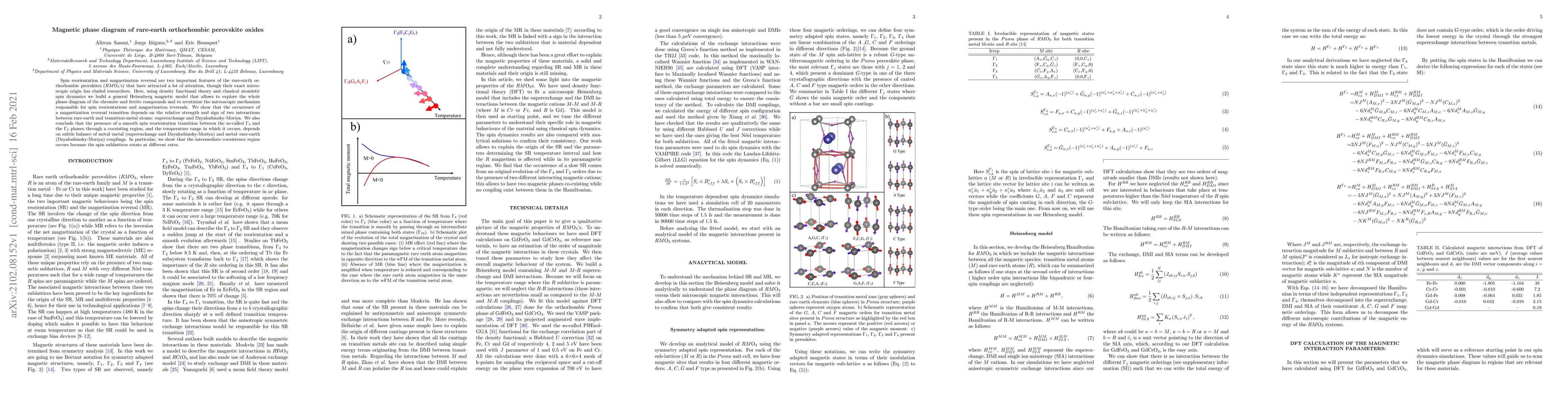 This paper constructs a Heisenberg magnetic model to explore the magnetic phase diagram of rare-earth orthorhombic perovskite oxides, revealing that magnetization reversal transitions depend on the relative strength and sign of superexchange and Dzyaloshinsky-Moriya interactions. It also finds that spin reorientation transitions are influenced by the balance of various magnetic couplings, with an intermediate coexistence region due to differing spin sublattice rotation rates.