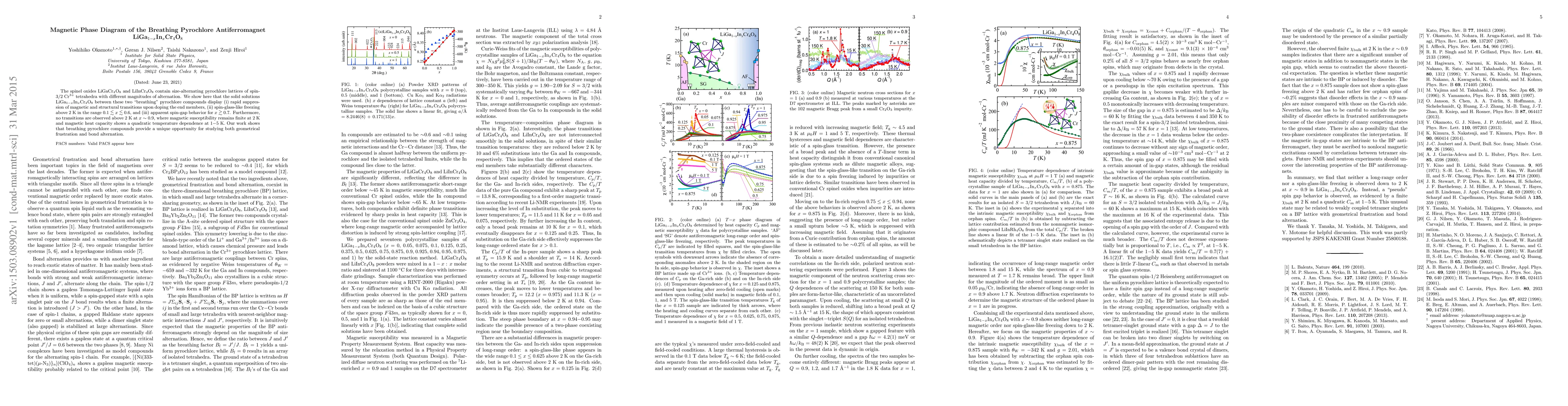 This paper investigates the magnetic phase diagram of LiGa1-xInxCr4O8, revealing spin-glass behavior and suppression of magnetic transitions with increasing In doping, alongside a spin-gap phenomenon for higher doping levels. The study highlights the unique properties of breathing pyrochlore compounds in geometrical frustration and bond alternation.