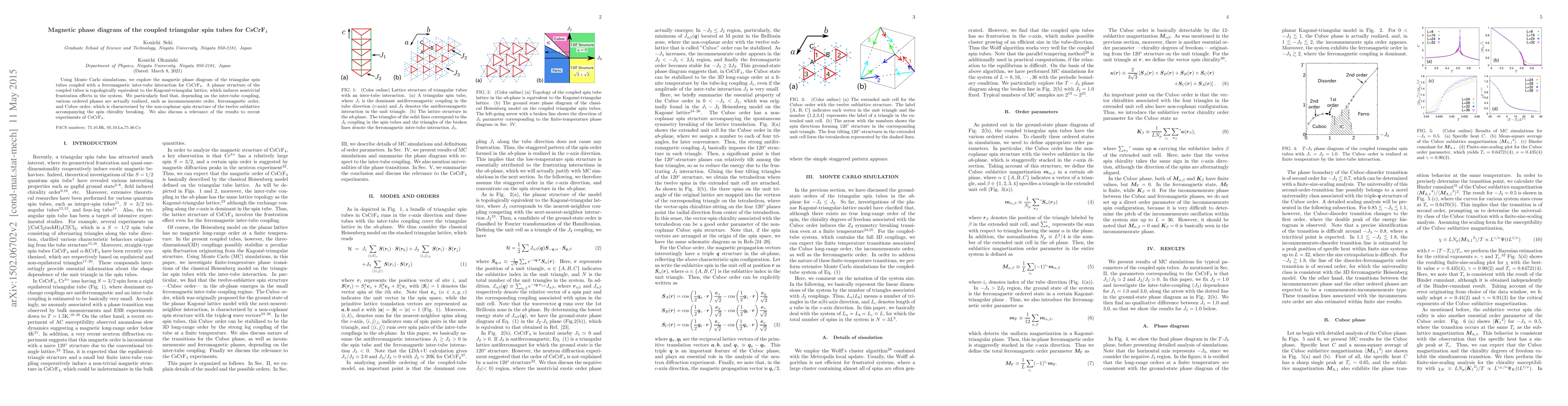 Using Monte Carlo simulations, we explore the magnetic phase diagram of the triangular spin tubes coupled with a ferromagnetic inter-tube interaction for CsCrF4. A planar structure of the coupled tubes is topologically equivalent to the Kagome-triangular lattice, which induces nontrivial frustration effects in the system. We particularly find that, depending on the inter-tube coupling, various ordered phases are actually realized, such as incommensurate order, ferromagnetic order, and Cuboc order, which is characterized by the non-coplanar spin structure of the twelve sublattice accompanying the spin chirality breaking. We also discuss a relevance of the results to recent experiments of CsCrF4.