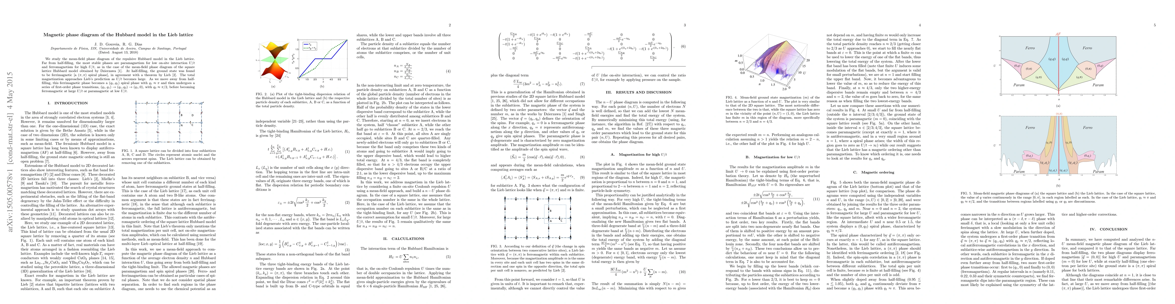This study explores the magnetic phase diagram of the Hubbard model in the Lieb lattice, revealing paramagnetic and ferromagnetic phases at low and high on-site interactions, respectively. At half-filling, a ferrimagnetic $(\pi,\pi)$ spiral phase is observed, transitioning through a series of first-order phase changes before becoming ferromagnetic or paramagnetic.