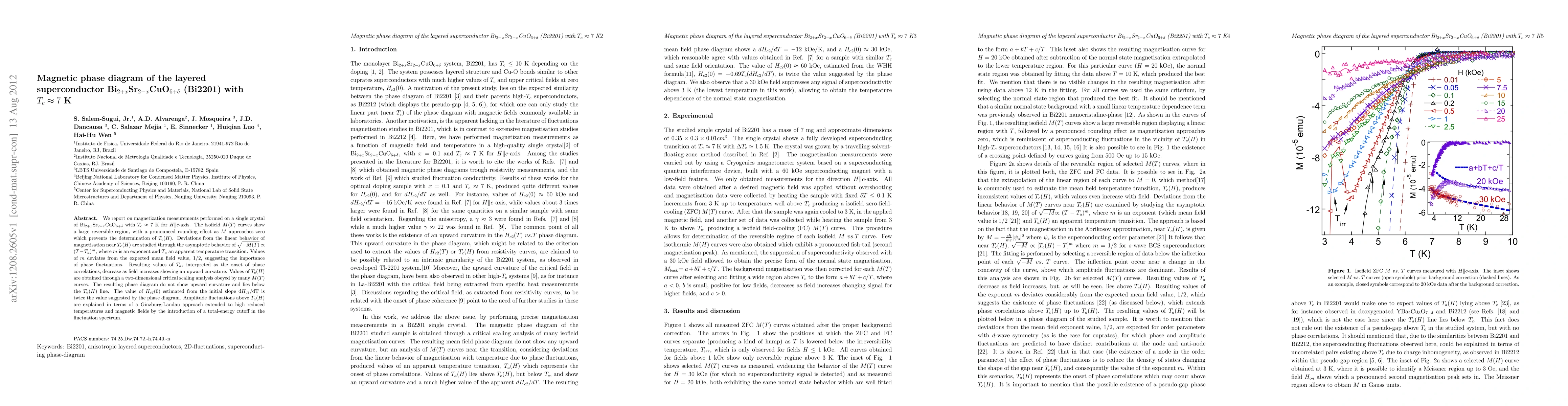 We report on magnetization measurements performed on a single crystal of Bi{2+x}Sr{2-x}CuO{6+\delta} with Tc\sim7 K for H||c-axis. The isofield M(T) curves show a large reversible region, with a pronounced rounding effect as M approaches zero which prevents the determination of Tc(H). Deviations from the linear behavior of magnetisation near Tc(H) are studied through the asymptotic behavior of $\sqrt{-M(T)}\sim(T-Ta)^m$, where m is an exponent and Ta an apparent temperature transition. Values of m deviates from the expected mean field value, 1/2, suggesting the importance of phase fluctuations. Resulting values of Ta, interpreted as the onset of phase correlations, decrease as field increases showing an upward curvature. Values of Tc(H) are obtained through a two-dimensional critical scaling analysis obeyed by many M(T) curves. The resulting phase diagram do not show upward curvature and lies below the Ta(H) line. The value of H{c2}(0) estimated from the initial slope $H_{c2}/dT is twice the value suggested by the phase diagram. Amplitude fluctuations above Ta(H) are explained in terms of a Ginzburg-Landau approach extended to high reduced temperatures and magnetic fields by the introduction of a total-energy cutoff in the fluctuation spectrum.