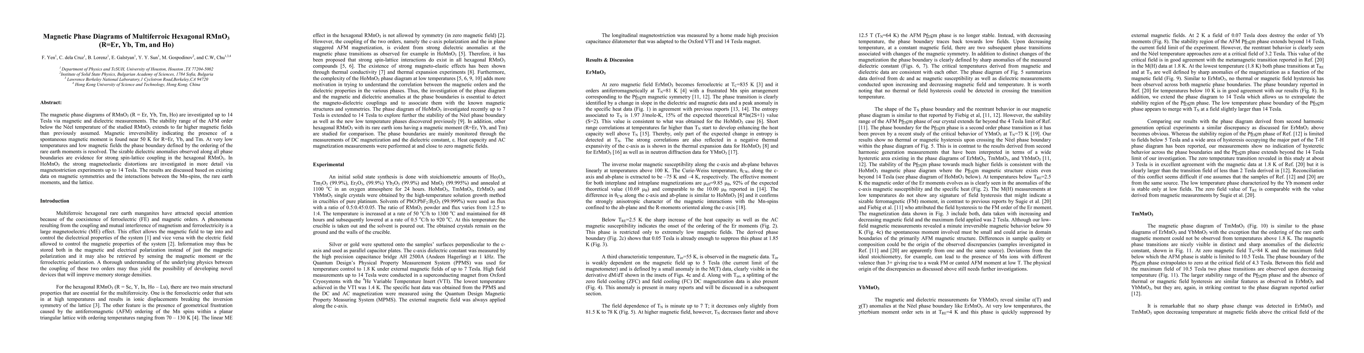 This paper investigates the magnetic phase diagrams of multiferroic hexagonal RMnO3 (R=Er, Yb, Tm, Ho) under high magnetic fields, revealing extended stability of AFM order and magnetic irreversibility near 50 K. Strong spin-lattice coupling and magnetoelastic distortions are observed, with detailed studies on HoMnO3.