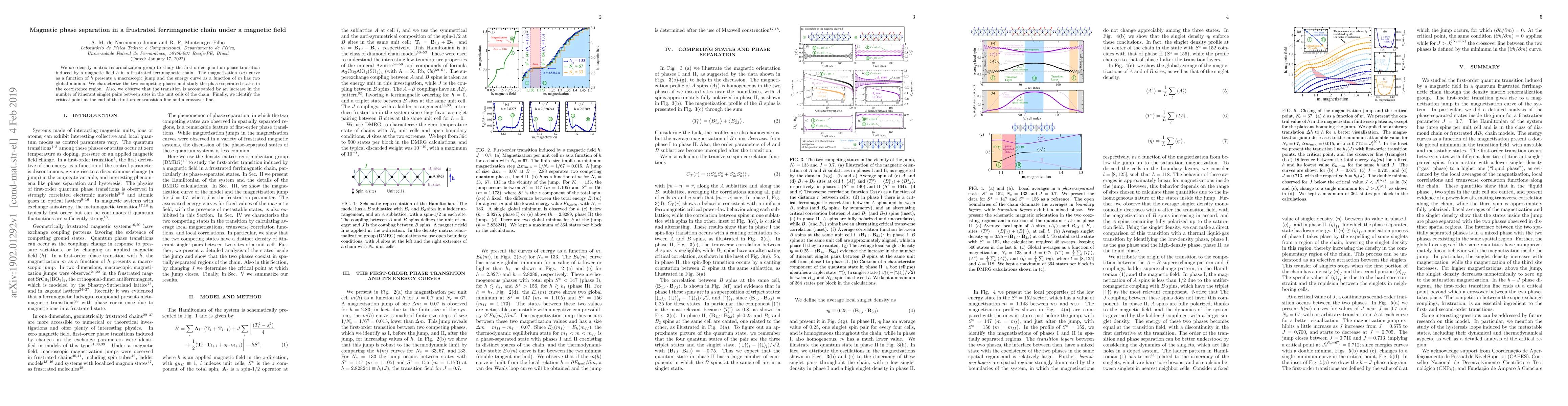 We use density matrix renormalization group to study the first-order quantum phase transition induced by a magnetic field $h$ in a frustrated ferrimagnetic chain. The magnetization ($m$) curve as a function of $h$ presents a macroscopic jump and the energy curve as a function of $m$ has two global minima. We characterize the two competing phases and study the phase-separated states in the coexistence region. Also, we observe that the transition is accompanied by an increase in the number of itinerant singlet pairs between sites in the unit cells of the chain. Finally, we identify the critical point at the end of the first-order transition line and a crossover line.