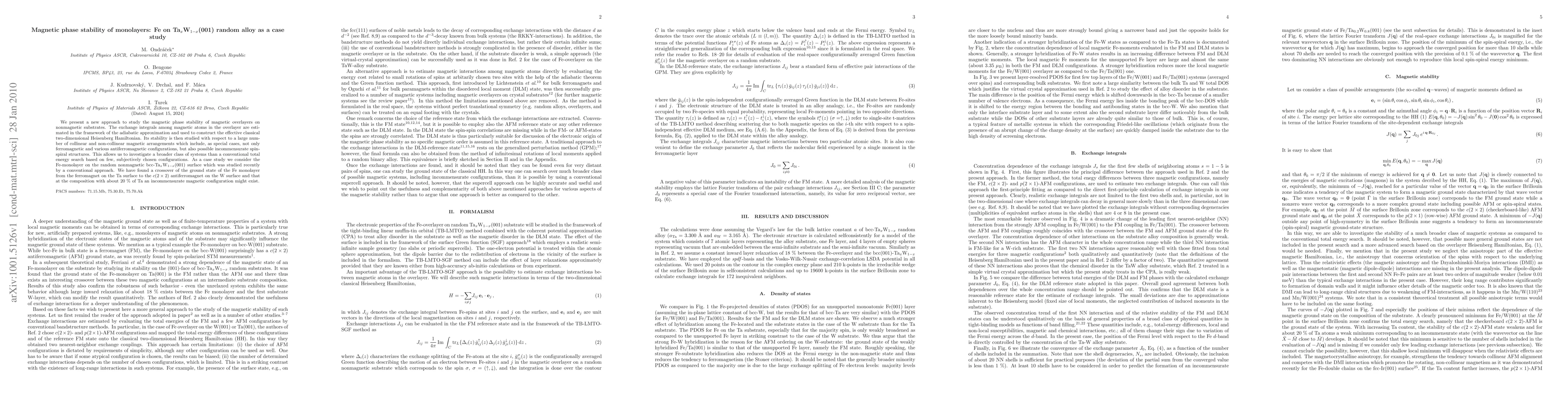 We present a new approach to study the magnetic phase stability of magnetic overlayers on nonmagnetic substrates. The exchange integrals among magnetic atoms in the overlayer are estimated in the framework of the adiabatic approximation and used to construct the effective classical two-dimensional Heisenberg Hamiltonian. Its stability is then studied with respect to a large number of collinear and non-collinear magnetic arrangements which include, as special cases, not only ferromagnetic and various antiferromagnetic configurations, but also possible incommensurate spin-spiral structures. This allows us to investigate a broader class of systems than a conventional total energy search based on few, subjectively chosen configurations. As a case study we consider the Fe-monolayer on the random nonmagnetic bcc-Ta(x)W(1-x) (001) surface which was studied recently by a conventional approach. We have found a crossover of the ground state of the Fe monolayer from the ferromagnet on the Ta surface to the c(2x2) antiferromagnet on the W surface and that at the composition with about 20 % of Ta an incommensurate magnetic configuration might exist.