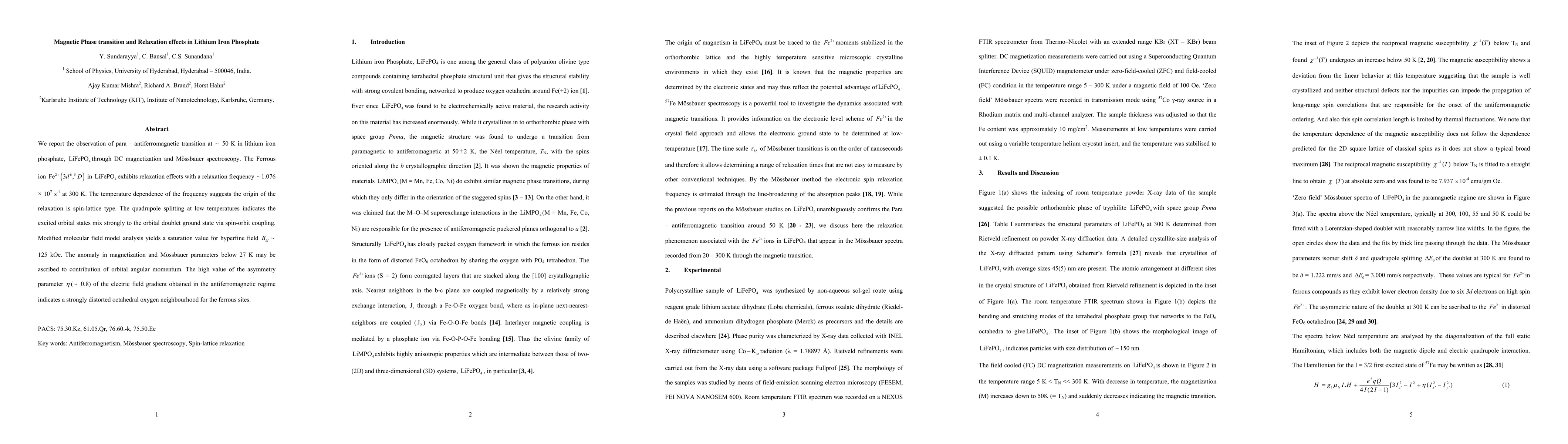 We report the observation of para - antiferromagnetic transition at ~ 50 K in lithium iron phosphate, LiFePO4 through DC magnetization and M\"ossbauer spectroscopy. The Ferrous ion Fe2+ (3d6, 5D) in LiFePO4 exhibits relaxation effects with a relaxation frequency ~1.076 \times 10(rise to 7) s-1 at 300 K. The temperature dependence of the frequency suggests the origin of the relaxation is spin-lattice type. The quadrupole splitting at low temperatures indicates the excited orbital states mix strongly to the orbital doublet ground state via spin-orbit coupling. Modified molecular field model analysis yields a saturation value for hyperfine field ~125 kOe. The anomaly in magnetization and M\"ossbauer parameters below 27 K may be ascribed to contribution of orbital angular momentum. The high value of the asymmetry parameter ({\eta} ~ 0.8) of the electric field gradient obtained in the antiferromagnetic regime indicates a strongly distorted octahedral oxygen neighbourhood for the ferrous sites.