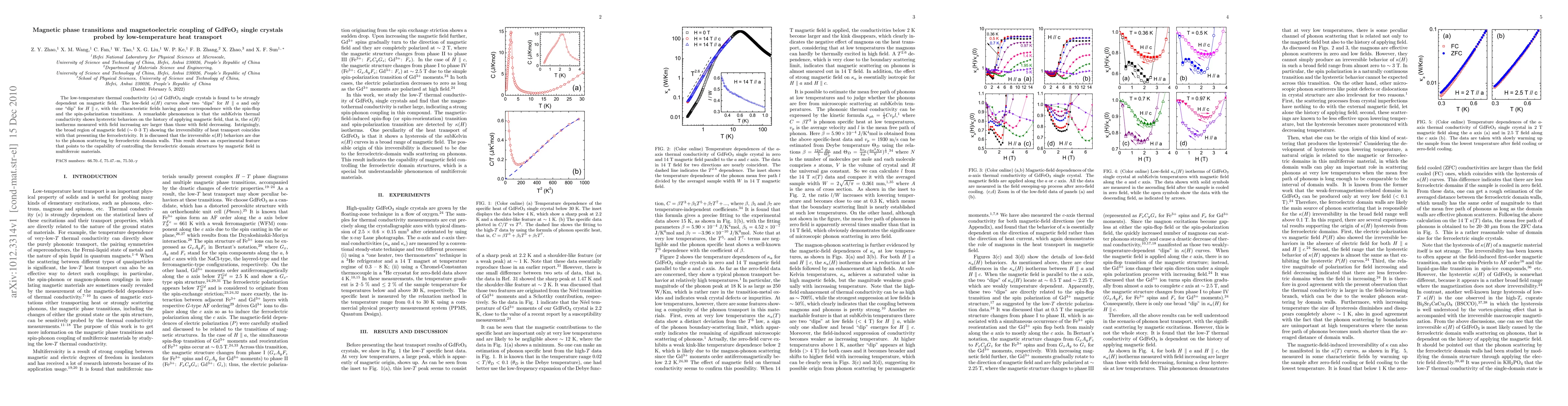 The low-temperature thermal conductivity (\kappa) of GdFeO_3 single crystals is found to be strongly dependent on magnetic field. The low-field \kappa (H) curves show two "dips" for H \parallel a and only one "dip" for H \parallel c, with the characteristic fields having good correspondence with the spin-flop and the spin-polarization transitions. A remarkable phenomenon is that the subKelvin thermal conductivity shows hysteretic behaviors on the history of applying magnetic field, that is, the \kappa(H) isotherms measured with field increasing are larger than those with field decreasing. Intriguingly, the broad region of magnetic field (\sim 0--3 T) showing the irreversibility of heat transport coincides with that presenting the ferroelectricity. It is discussed that the irreversible \kappa(H) behaviors are due to the phonon scattering by ferroelectric domain walls. This result shows an experimental feature that points to the capability of controlling the ferroelectric domain structures by magnetic field in multiferroic materials.