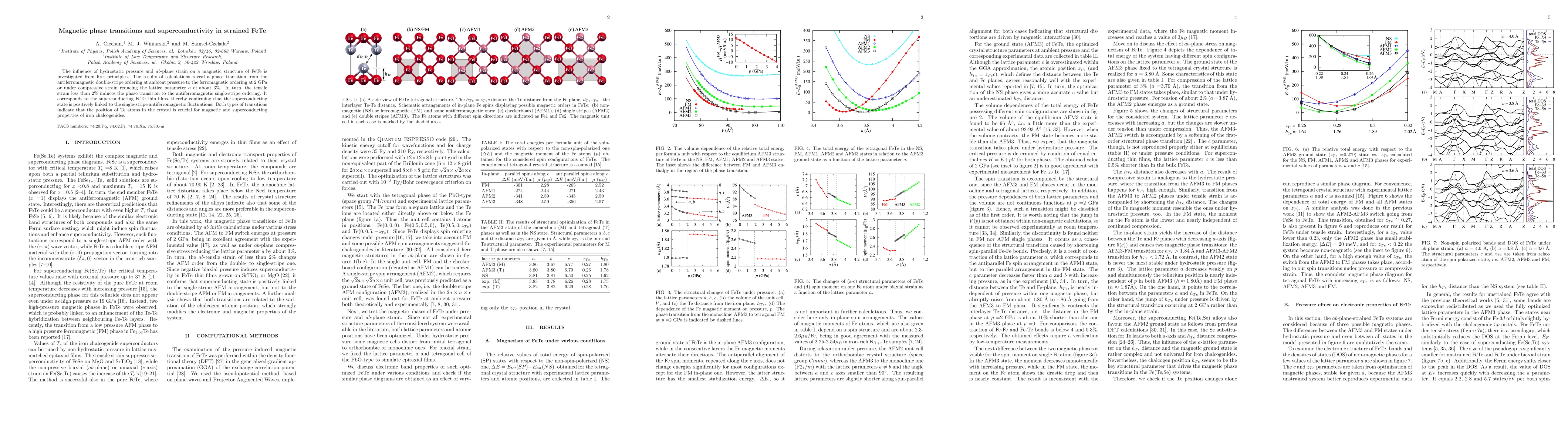 The influence of hydrostatic pressure and ab-plane strain on the magnetic structure of FeTe is investigated from first principles. The results of calculations reveal a phase transition from antiferromagnetic double-stripe ordering at ambient pressure to ferromagnetic ordering at 2 GPa, or under compressive strain reducing the lattice parameter a by about 3%. In turn, a tensile strain of less than 2% induces the phase transition to antiferromagnetic single-stripe ordering. It corresponds to the superconducting FeTe thin films, thereby confirming that the superconducting state is positively linked to single-stripe antiferromagnetic fluctuations. Both types of transition indicate that the position of Te atoms in the crystal is crucial for the magnetic and superconducting properties of iron chalcogenides.