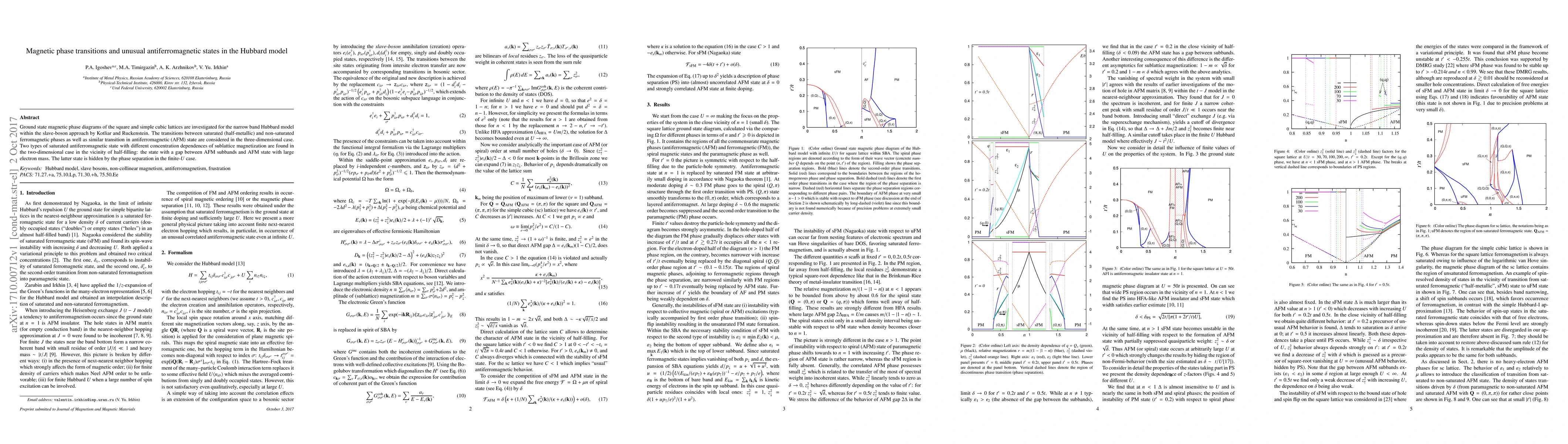 This research uses the slave-boson approach to explore magnetic phase transitions in the Hubbard model on square and cubic lattices, identifying two distinct saturated antiferromagnetic states near half-filling in 2D, one with subband gap and the other having large electron mass. The study finds that the latter state is obscured by phase separation at finite U.