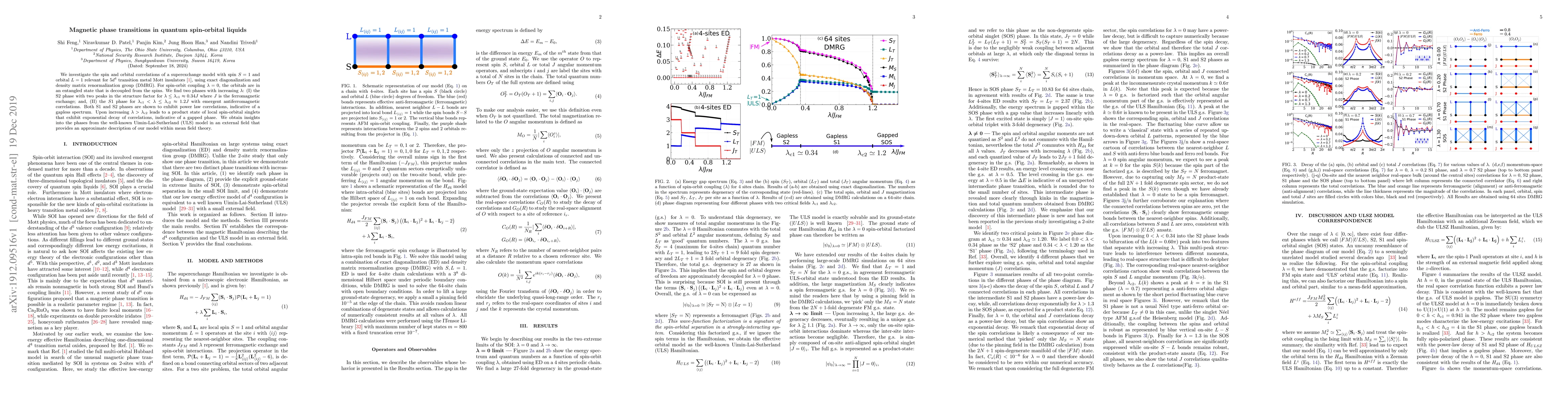 We investigate the spin and orbital correlations of a superexchange model with spin $S=1$ and orbital $L=1$ relevant for $5d^4$ transition metal Mott insulators, using exact diagonalization and density matrix renormalization group (DMRG). For spin-orbit coupling $\lambda=0$, the orbitals are in an entangled state that is decoupled from the spins. We find two phases with increasing $\lambda$: (I) the S2 phase with two peaks in the structure factor for $\lambda\le\lambda_{c1}\approx 0.34 J$ where $J$ is the ferromagnetic exchange; and, (II) the $S1$ phase for $\lambda_{c1}<\lambda\le\lambda_{c2}\approx 1.2 J$ with emergent antiferromagnetic correlations. Both S1 and S2 phases are shown to exhibit power law correlations, indicative of a gapless spectrum. Upon increasing $\lambda > \lambda_{c2}$ leads to a product state of local spin-orbital singlets that exhibit exponential decay of correlations, indicative of a gapped phase. We obtain insights into the phases from the well-known Uimin-Lai-Sutherland (ULS) model in an external field that provides an approximate description of our model within mean field theory.