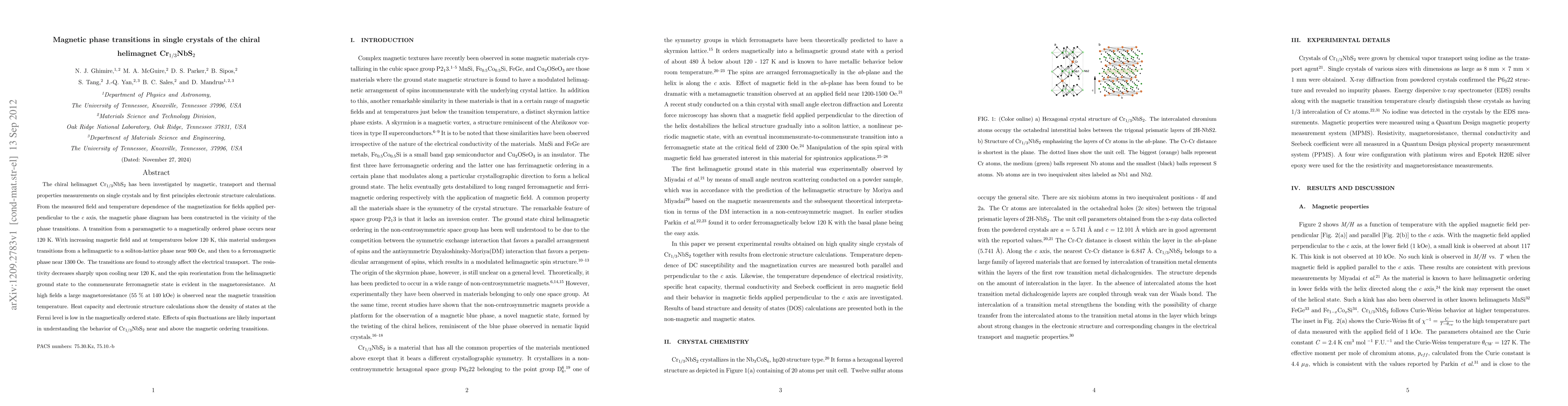 This study investigates the magnetic phase transitions in Cr1/3NbS2 single crystals, revealing transitions from paramagnetic to helimagnetic, soliton-lattice, and ferromagnetic phases with temperature and magnetic field. The transitions significantly affect electrical transport, with sharp resistivity decreases and large magnetoresistance observed near the magnetic ordering temperature.