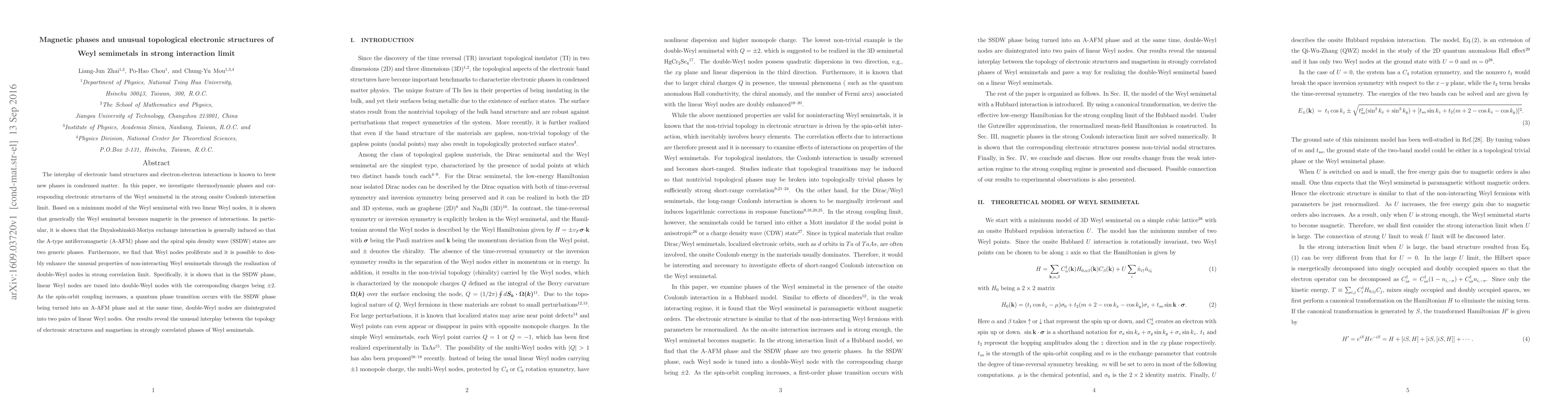 This paper explores the magnetic phases and topological electronic structures of Weyl semimetals under strong electron-electron interactions, revealing that the system typically becomes magnetic, inducing A-type antiferromagnetic and spiral spin density wave phases. It also highlights the emergence of double-Weyl nodes and their transformation under varying spin-orbit coupling.