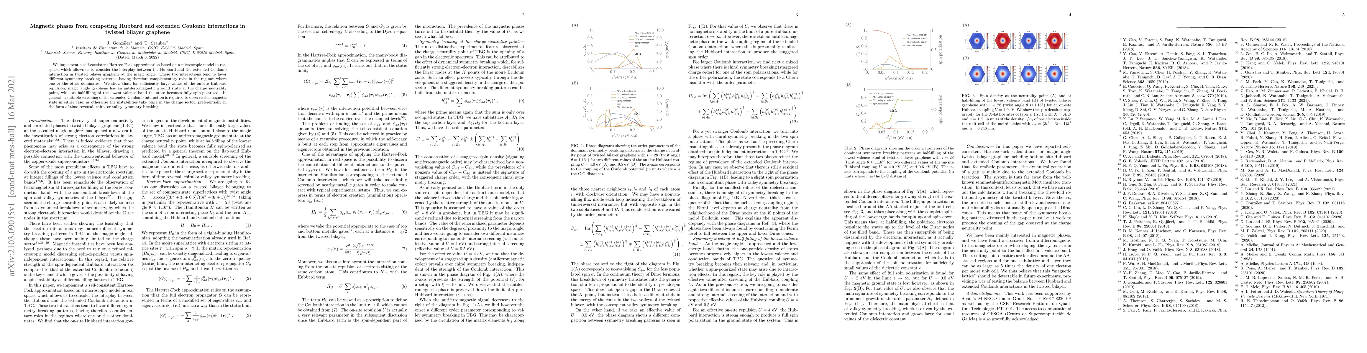 This paper explores the magnetic phases in twisted bilayer graphene at the magic angle, revealing that the interplay between Hubbard and extended Coulomb interactions leads to antiferromagnetic ground states under certain conditions, while also discussing the role of screening in preventing charge instabilities.