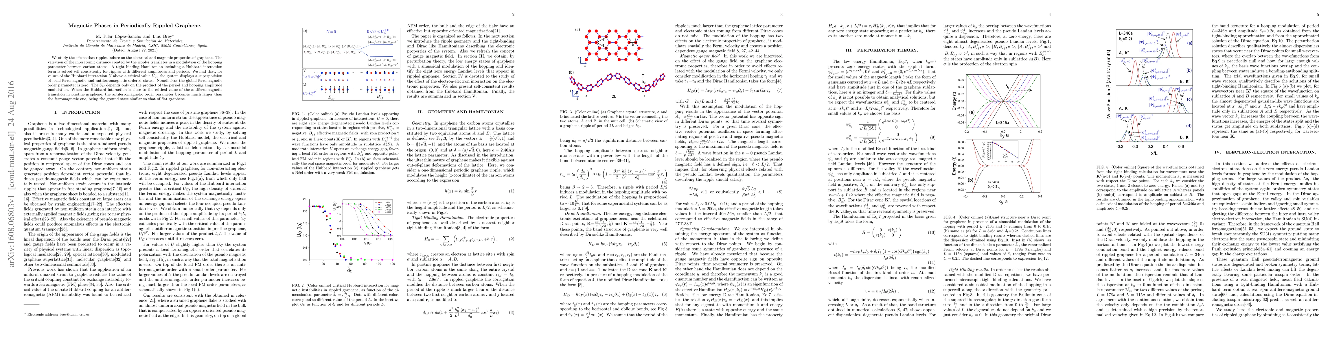 We study the effects that ripples induce on the electrical and magnetic properties of graphene. The variation of the interatomic distance created by the ripples translates in a modulation of the hopping parameter between carbon atoms. A tight binding Hamiltonian including a Hubbard interaction term is solved self consistently for ripples with different amplitudes and periods. We find that, for values of the Hubbard interaction $U$ above a critical value $U_C$, the system displays a superposition of local ferromagnetic and antiferromagnetic ordered states. Nonetheless the global ferromagnetic order parameter is zero. The $U_C$ depends only on the product of the period and hopping amplitude modulation. When the Hubbard interaction is close to the critical value of the antiferromagnetic transition in pristine graphene, the antiferromagnetic order parameter becomes much larger than the ferromagnetic one, being the ground state similar to that of flat graphene.