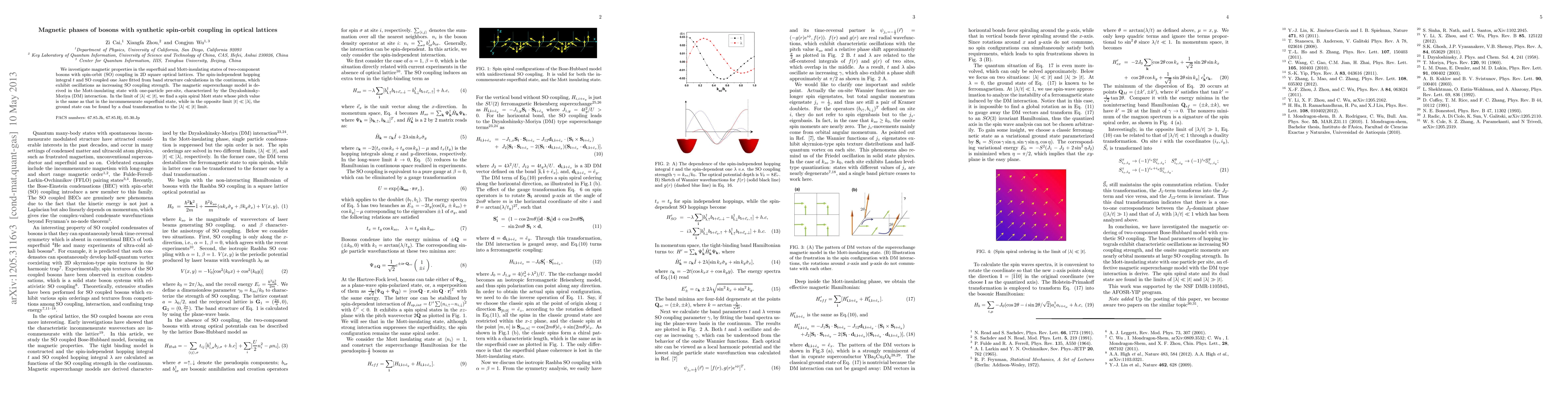We investigate magnetic properties in the superfluid and Mott-insulating states of two-component bosons with spin-orbit (SO) coupling in 2D square optical lattices. The spin-independent hopping integral $t$ and SO coupled one $\lambda $are fitted from band structure calculations in the continuum, which exhibit oscillations as increasing SO coupling strength. The magnetic superexchange model is derived in the Mott-insulating state with one-particle per-site, characterized by the Dzyaloshinsky-Moriya (DM) interaction. In the limit of $|\lambda|\ll |t|$, we find a spin spiral Mott state whose pitch value is the same as that in the incommensurate superfluid state, while in the opposite limit $|t| \ll |\lambda|$, the ground state can be found by a dual transformation to the $|\lambda|\ll|t|$ limit.