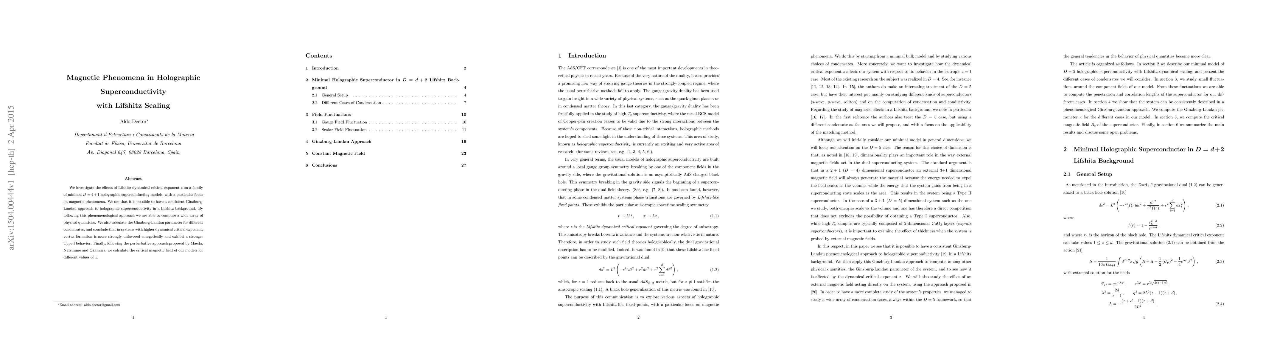 We investigate the effects of Lifshitz dynamical critical exponent z on a family of minimal D=4+1 holographic superconducting models, with a particular focus on magnetic phenomena. We see that it is possible to have a consistent Ginzburg-Landau approach to holographic superconductivity in a Lifshitz background. By following this phenomenological approach we are able to compute a wide array of physical quantities. We also calculate the Ginzburg-Landau parameter for different condensates, and conclude that in systems with higher dynamical critical exponent, vortex formation is more strongly unfavored energetically and exhibit a stronger Type I behavior. Finally, following the perturbative approach proposed by Maeda, Natsuume and Okamura, we calculate the critical magnetic field of our models for different values of z.