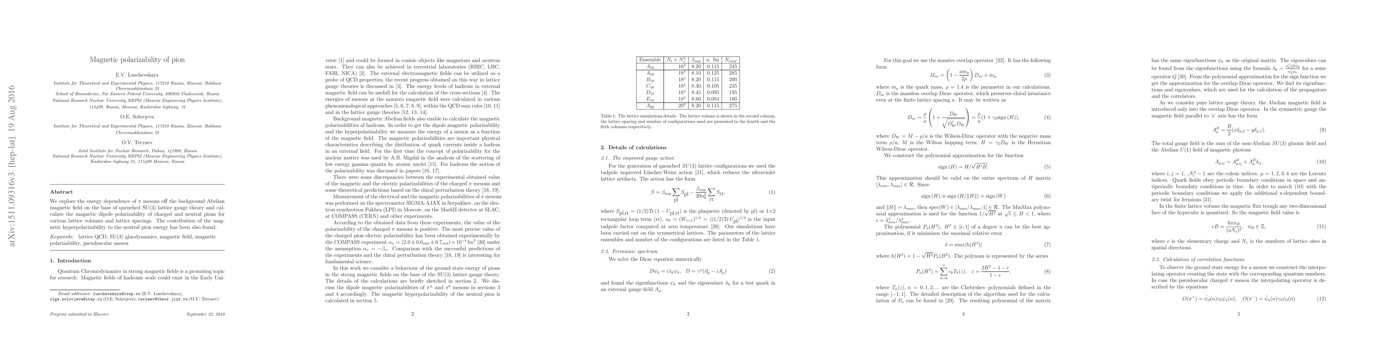 We explore the energy dependence of $\pi$ mesons off the background abelian magnetic field on the base of quenched SU(3) lattice gauge theory and calculate the magnetic dipole polarizability of charged and neutral pions for various lattice volumes and lattice spacings. The contribution of the magnetic hyperpolarizability to the neutral pion energy has been also found.