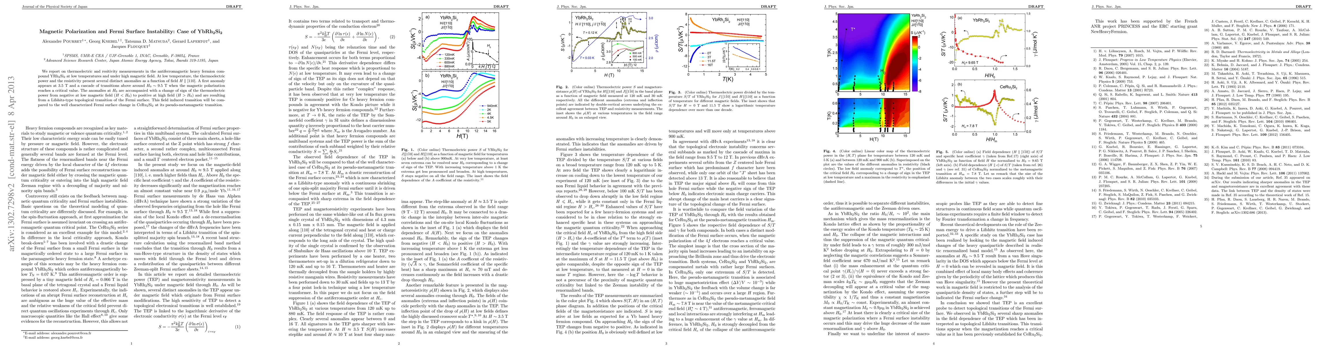 We report thermoelectric and resitivity measurements of antiferromagnetic heavy fermion compound YRh2Si2 at low temperatures down and under high magnetic field. At low temperature, the thermoelectric power and the resistivity present several distinct anomalies as a function of field around H_0 ~ 9.5 T when the magnetic polarization reaches a critical value. The anomalies are accompanied with a change of sign from negative at low magnetic field to positive at high field (H>H_0) and are resulting from a Lifshitz-type topological transition of the Fermi surface. A logarithmic divergence of S/T at T \to 0 K just above H_0 (H=11.5 T) is quite comparable to the well known divergence of S/T in the temperature range above the antiferromagnetic order at H=0 T referred to as non Fermi liquid behavior. The transition will be compared to the well characterized Fermi surface change in CeRu2Si2 at its pseudo-metamagnetic transition.