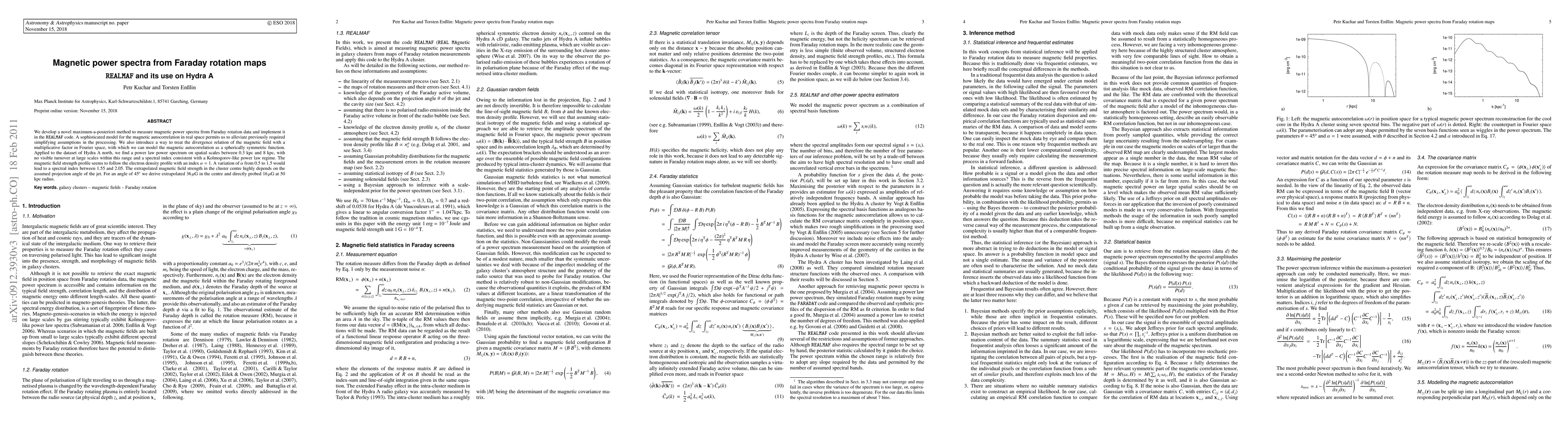 We develop a novel maximum-a-posteriori method to measure magnetic power spectra from Faraday rotation data and implement it in the REALMAF code. A sophisticated model for the magnetic autocorrelation in real space permits us to alleviate previously required simplifying assumptions in the processing. We also introduce a way to treat the divergence relation of the magnetic field with a multiplicative factor in Fourier space, with which we can model the magnetic autocorrelation as a spherically symmetric function. Applied to the dataset of Hydra A north, we find a power law power spectrum on spatial scales between 0.3 kpc and 8 kpc, with no visible turnover at large scales within this range and a spectral index consistent with a Kolmogorov-like power law regime. The magnetic field strength profile seems to follow the electron density profile with an index alpha=1. A variation of alpha from 0.5 to 1.5 would lead to a spectral index between 1.55 and 2.05. The extrapolated magnetic field strength in the cluster centre highly depends on the assumed projection angle of the jet. For an angle of 45 degree we derive extrapolated 36 muG in the centre and directly probed 16 muG at 50 kpc radius.