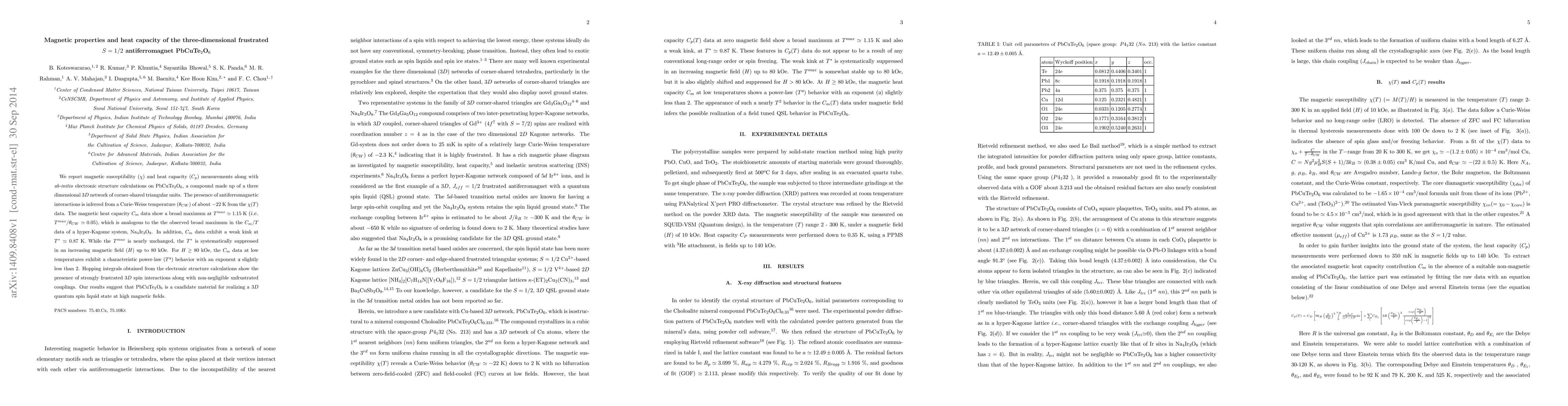 Researchers studied PbCuTe2O6, a 3D antiferromagnet with frustrated spin interactions, finding a broad maximum in magnetic heat capacity at low temperatures that vanishes at high magnetic fields.