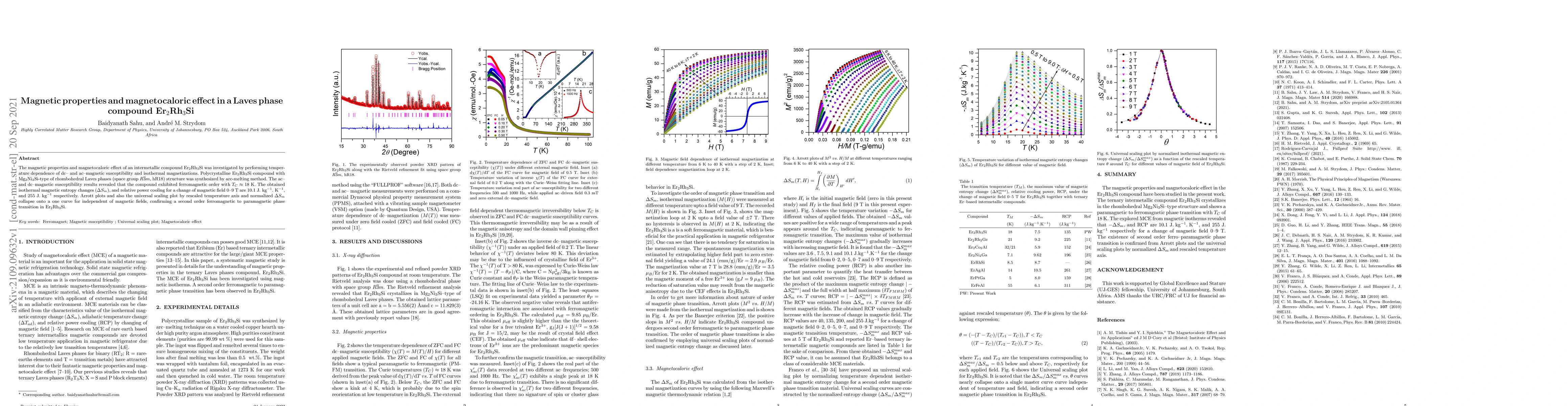 The magnetic properties and magnetocaloric effect of an intermetallic compound $\mathrm{Er_2Rh_3Si}$ was investigated by performing temperature dependence of dc- and ac-magnetic susceptibility and isothermal magnetizations. Polycrystalline $\mathrm{Er_2Rh_3Si}$ compound with $\mathrm{Mg_2Ni_3Si}$-type of rhombohedral Laves phases (space group $R\overline{3}m$, hR18) structure was synthesized by arc-melting method. The ac- and dc-magnetic susceptibility results revealed that the compound exhibited ferromagnetic order with $T_C$ $\approx$ 18 K. The obtained isothermal magnetic entropy changes ($\Delta S_m$), and relative power cooling for a change of magnetic field 0-9 T are 10.1~$\mathrm{J.~kg^{-1}.~K^{-1}}$, and 255 J. kg$^{-1}$ respectively. Arrott plots and also the universal scaling plot by rescaled temperature axis and normalized $\Delta S_m$ collapse onto a one curve for independent of magnetic fields, confirming a second-order ferromagnetic to paramagnetic phase transition in $\mathrm{Er_2Rh_3Si}$.