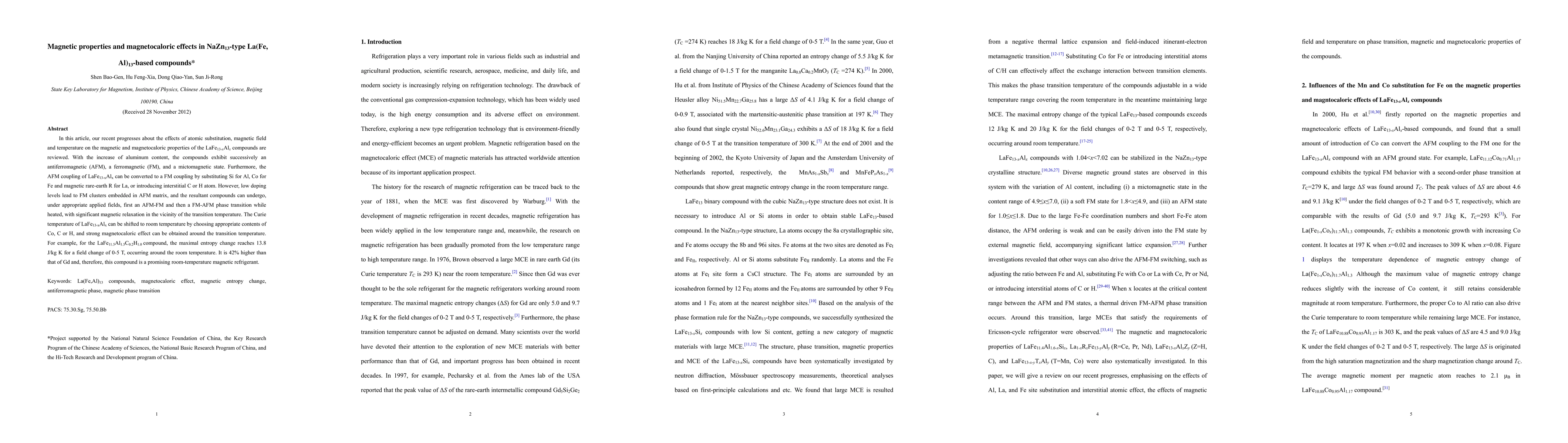 In this article, our recent progresses about the effects of atomic substitution, magnetic field and temperature on the magnetic and magnetocaloric properties of the LaFe13-xAlx compounds are reviewed. With the increase of aluminum content, the compounds exhibit successively an antiferromagnetic (AFM), a ferromagnetic (FM), and a mictomagnetic state. Furthermore, the AFM coupling of LaFe13-xAlx can be converted to a FM coupling by substituting Si for Al, Co for Fe and magnetic rare-earth R for La, or introducing interstitial C or H atom. However, low doping levels lead to FM clusters embedded in AFM matrix, and the resultant compounds can undergo, under appropriate applied fields, first an AFM-FM and then a FM-AFM phase transition while heated, with significant magnetic relaxation in the vicinity of the transition temperature. The Curie temperature of LaFe13-xAlx can be shifted to room temperature by choosing appropriate contents of Co, C or H, and strong magnetocaloric effect can be obtained around the transition temperature. For example, for the LaFe11.5Al1.5C0.2H1.0 compound, the maximal entropy change reaches 13.8 J/kg K for a field change of 0-5 T, occurring around the room temperature. It is 42% higher than that of Gd and, therefore, this compound is a promising room-temperature magnetic refrigerant.