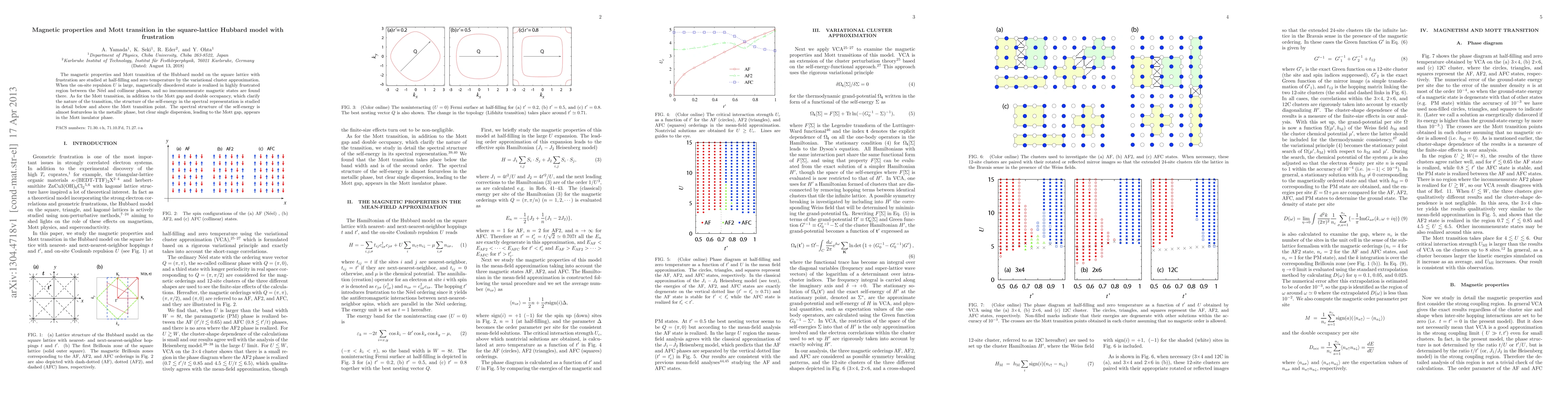 This paper investigates the magnetic properties and Mott transition in the frustrated square-lattice Hubbard model using the variational cluster approximation. It finds a magnetically disordered state in the highly frustrated region and observes a clear single dispersion in the self-energy's spectral structure transitioning to a Mott gap in the Mott insulator phase.
