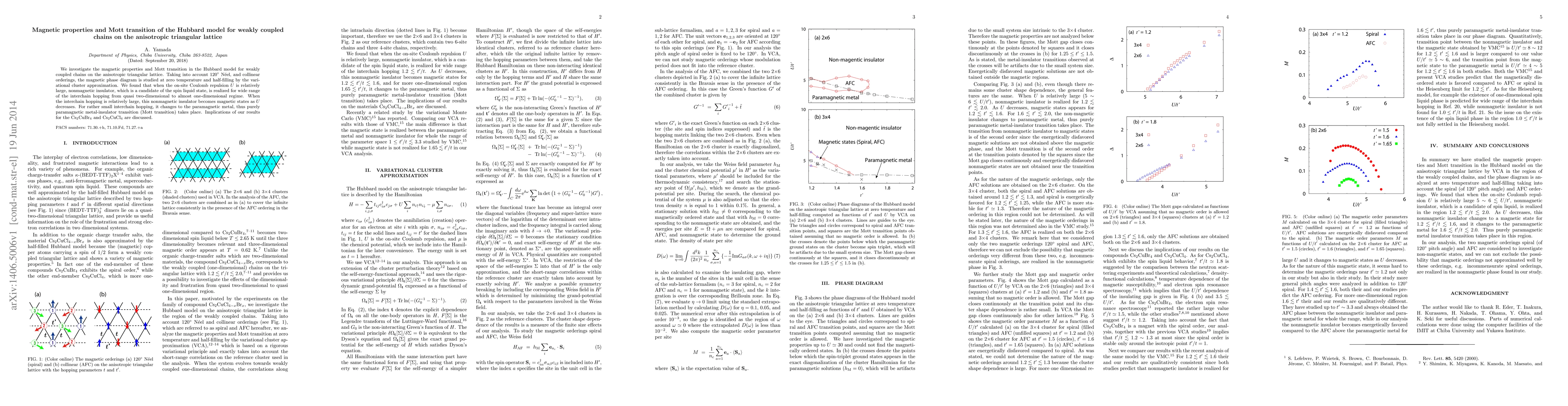 This paper explores the magnetic properties and Mott transition in the Hubbard model on an anisotropic triangular lattice with weakly coupled chains. The study reveals that large on-site repulsion $U$ leads to a nonmagnetic insulator, potentially a spin liquid, transitioning to magnetic states as $U$ decreases, and finally to a paramagnetic metal for small interchain hopping, indicating a Mott transition.