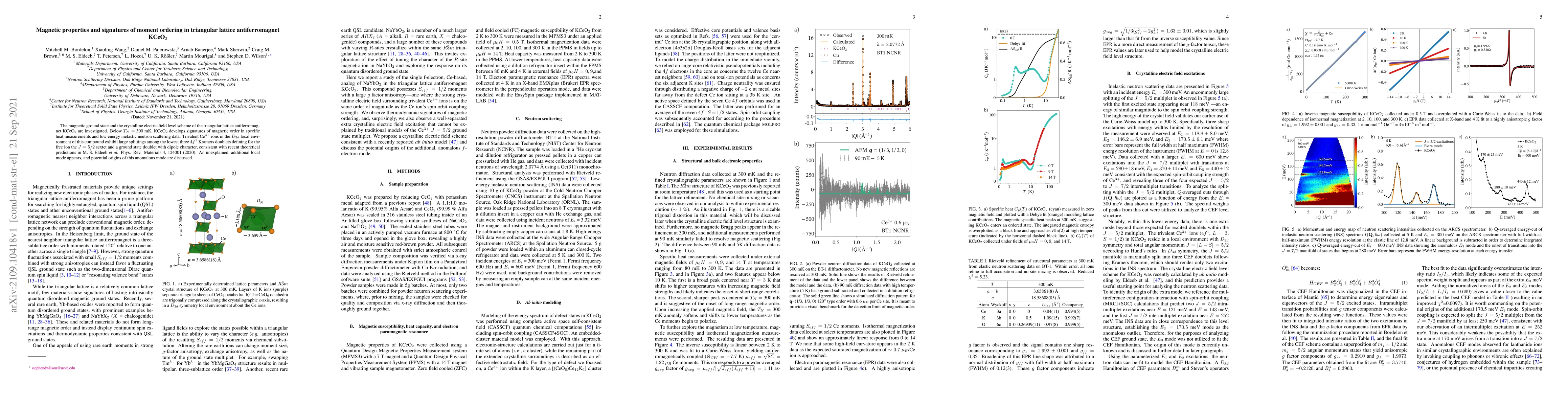 The magnetic ground state and the crystalline electric field level scheme of the triangular lattice antiferromagnet KCeO$_2$ are investigated. Below $T_N =$ 300 mK, KCeO$_2$ develops signatures of magnetic order in specific heat measurements and low energy inelastic neutron scattering data. Trivalent Ce$^{3+}$ ions in the $D_{3d}$ local environment of this compound exhibit large splittings among the lowest three $4f^1$ Kramers doublets defining for the free ion the $J = 5/2$ sextet and a ground state doublet with dipole character, consistent with recent theoretical predictions in M. S. Eldeeb et al. Phys. Rev. Materials 4, 124001 (2020). An unexplained, additional local mode appears, and potential origins of this anomalous mode are discussed.