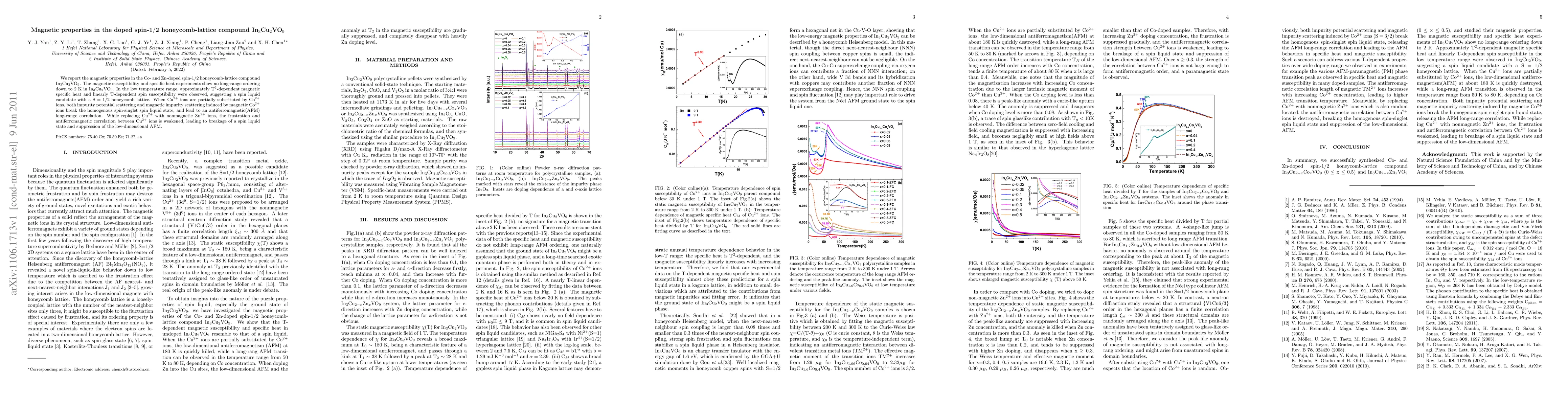 Researchers studied magnetic properties in a spin-1/2 honeycomb-lattice compound In$_3$Cu$_2$VO$_9$, finding that doping with Co or Zn ions breaks the spin liquid state, leading to antiferromagnetic ordering.