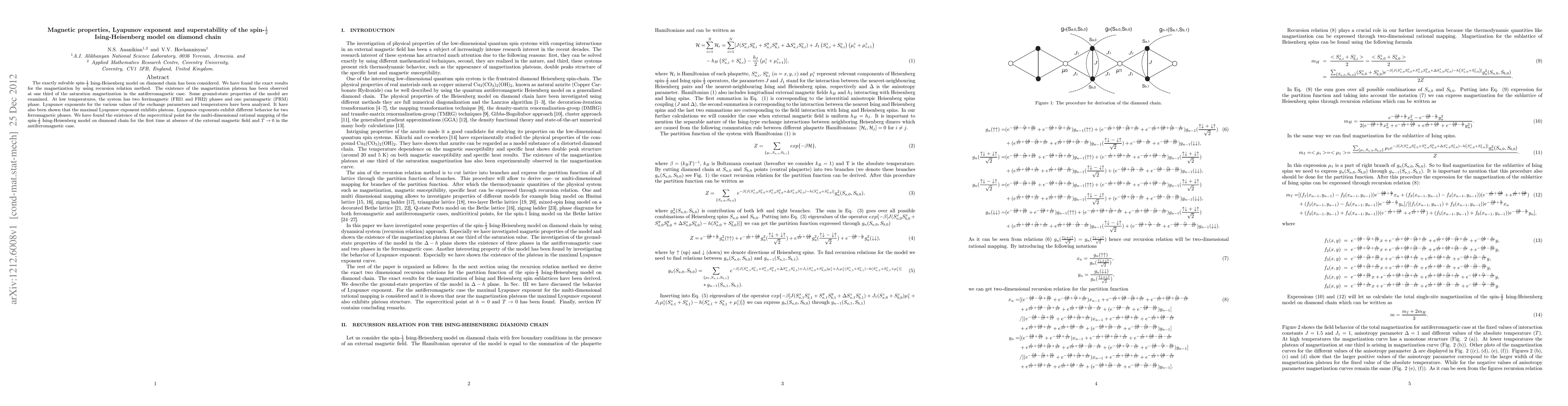 This paper investigates the spin-1/2 Ising-Heisenberg model on a diamond chain, revealing magnetization plateaus and distinct ground-state phases. It also analyzes Lyapunov exponents and identifies a supercritical point in the absence of an external magnetic field, demonstrating the model's superstability.