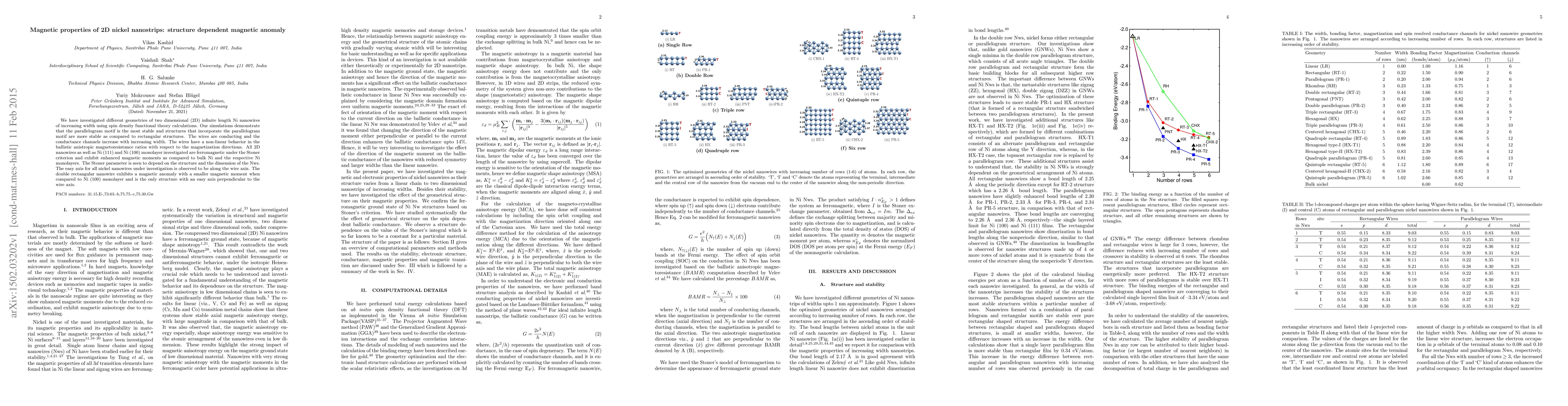 We have investigated different geometries of two dimensional (2D) infinite length Ni nanowires of increasing width using spin density functional theory calculations. Our simulations demonstrate that the parallelogram motif is the most stable and structures that incorporate the parallelogram motif are more stable as compared to rectangular structures. The wires are conducting and the conductance channels increase with increasing width. The wires have a non-linear behavior in the ballistic anistropic magnetoresistance ratios with respect to the magnetization directions. All 2D nanowires as well as Ni (111) and Ni (100) monolayer investigated are ferromagnetic under the Stoner criterion and exhibit enhanced magnetic moments as compared to bulk Ni and the respective Ni monolayers. The Stoner parameter is seen to depend on the structure and the dimension of the Nws. The easy axis for all nickel nanowires under investigation is observed to be along the wire axis. The double rectangular nanowire exhibits a magnetic anomaly with a smaller magnetic moment when compared to Ni (100) monolayer and is the only structure with an easy axis perpendicular to the wire axis.