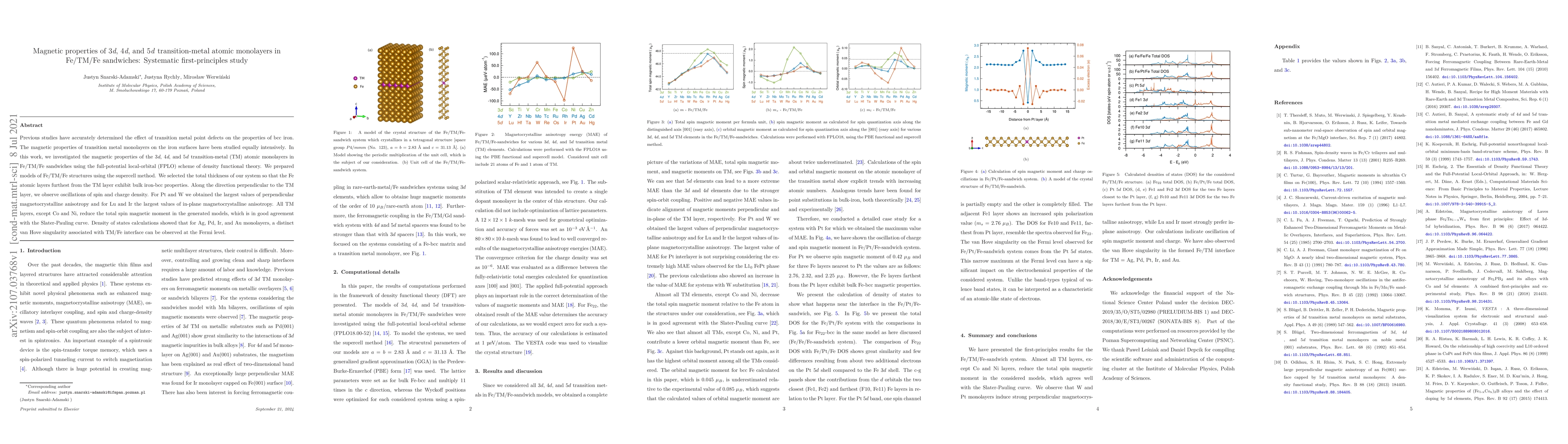 Previous studies have accurately determined the effect of transition metal point defects on the properties of bcc iron. The magnetic properties of transition metal monolayers on the iron surfaces have been studied equally intensively. In this work, we investigated the magnetic properties of the 3d, 4d, and 5d transition-metal (TM) atomic monolayers in Fe/TM/Fe sandwiches using the full-potential local-orbital (FPLO) scheme of density functional theory. We prepared models of Fe/TM/Fe structures using the supercell method. We selected the total thickness of our system so that the Fe atomic layers furthest from the TM layer exhibit bulk iron-bcc properties. Along the direction perpendicular to the TM layer, we observe oscillations of spin and charge density. For Pt and W we obtained the largest values of perpendicular magnetocrystalline anisotropy and for Lu and Ir the largest values of in-plane magnetocrystalline anisotropy. All TM layers, except Co and Ni, reduce the total spin magnetic moment in the generated models, which is in good agreement with the Slater-Pauling curve. Density of states calculations showed that for Ag, Pd, Ir, and Au monolayers, a distinct van Hove singularity associated with TM/Fe interface can be observed at the Fermi level.