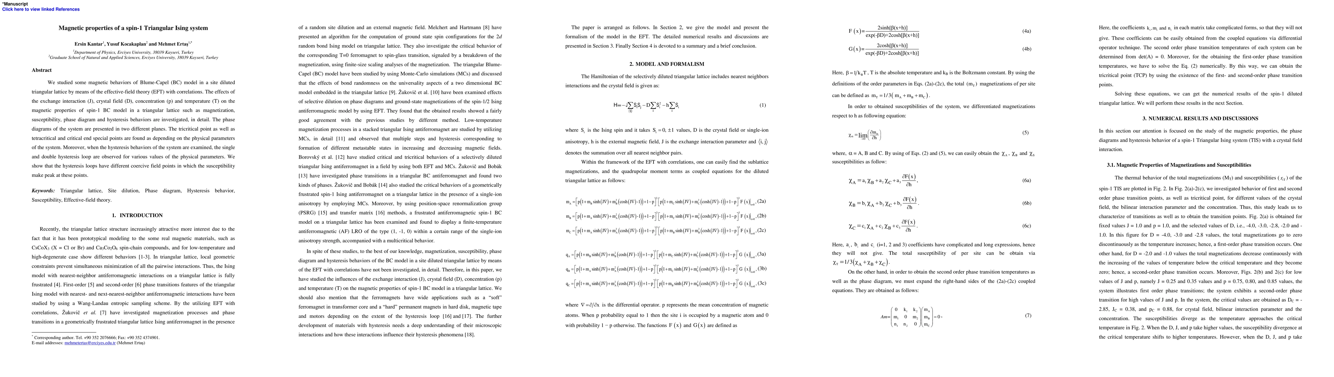We studied some magnetic behaviors of Blume-Capel (BC) model in a site diluted triangular lattice by means of the effective-field theory (EFT) with correlations. The effects of the exchange interaction (J), crystal field (D), concentration (p) and temperature (T) on the magnetic properties of spin-1 BC model in a triangular lattice such as magnetization, susceptibility, phase diagram and hysteresis behaviors are investigated, in detail. The phase diagrams of the system are presented in two different planes. The tricritical point as well as tetracritical and critical end special points are found as depending on the physical parameters of the system. Moreover, when the hysteresis behaviors of the system are examined, the single and double hysteresis loop are observed for various values of the physical parameters. We show that the hysteresis loops have different coercive field points in which the susceptibility make peak at these points.