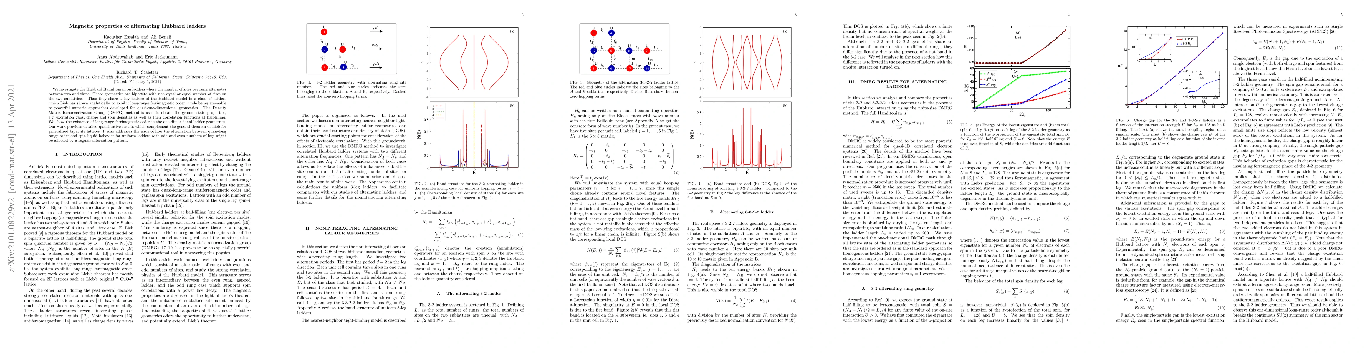 This research uses the Density Matrix Renormalization Group (DMRG) method to study the Hubbard model on alternating two- and three-site rung ladders, confirming long-range ferrimagnetic order. It complements Lieb's analytical theorem and explores how alternation impacts quasi-long range order and spin liquid behavior in uniform ladders.