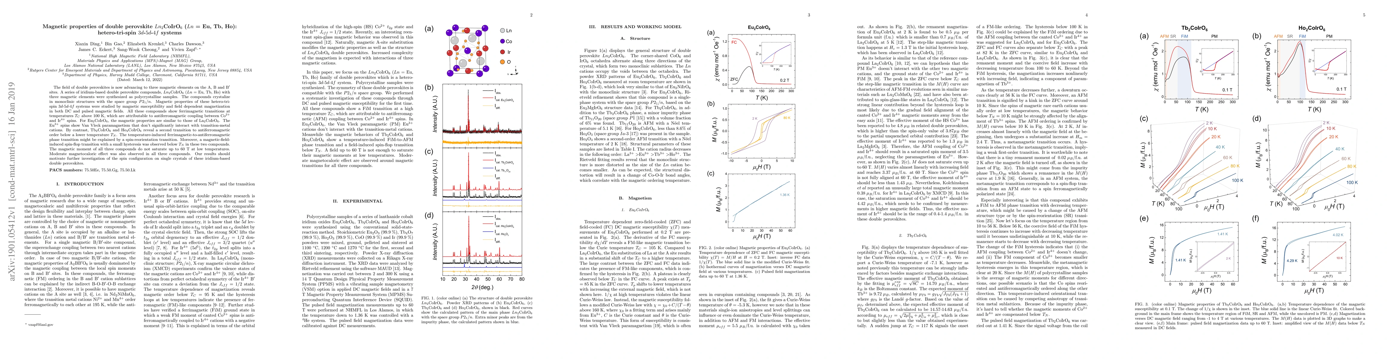 The field of double perovskites is now advancing to three magnetic elements on the A, B and B$'$ sites. A series of iridium-based double perovskite compounds, $Ln_2$CoIrO$_6$ ($Ln$ = Eu, Tb, Ho) with three magnetic elements were synthesized as polycrystalline samples. The compounds crystalize in monoclinic structures with the space group $P2_1/n$. Magnetic properties of these hetero-tri-spin $3d$-$5d$-$4f$ systems were studied by magnetic susceptibility and field dependent magnetization in both DC and pulsed magnetic fields. All these compounds show ferrimagnetic transitions at temperatures $T_C$ above 100 K, which are attributable to antiferromagnetic coupling between Co$^{2+}$ and Ir$^{4+}$ spins. For Eu$_2$CoIrO$_6$, the magnetic properties are similar to those of La$_2$CoIrO$_6$. The Eu$^{3+}$ spins show Van Vleck paramagnetism that don't significantly interact with transition-metal cations. By contrast, Tb$_2$CoIrO$_6$ and Ho$_2$CoIrO$_6$ reveal a second transition to antiferromagnetic order below a lower temperature $T_N$. The temperature-induced ferrimagnetic-to-antiferromagnetic phase transition might be explained by a spin-reorientation transition. Moreover, a magnetic-field-induced spin-flop transition with a small hysteresis was observed below $T_N$ in these two compounds. The magnetic moment of all three compounds do not saturate up to 60 T at low temperatures. Moderate magnetocaloric effect was also observed in all three compounds. Our results should motivate further investigation of the spin configuration on single crystals of these iridium-based double perovskites.